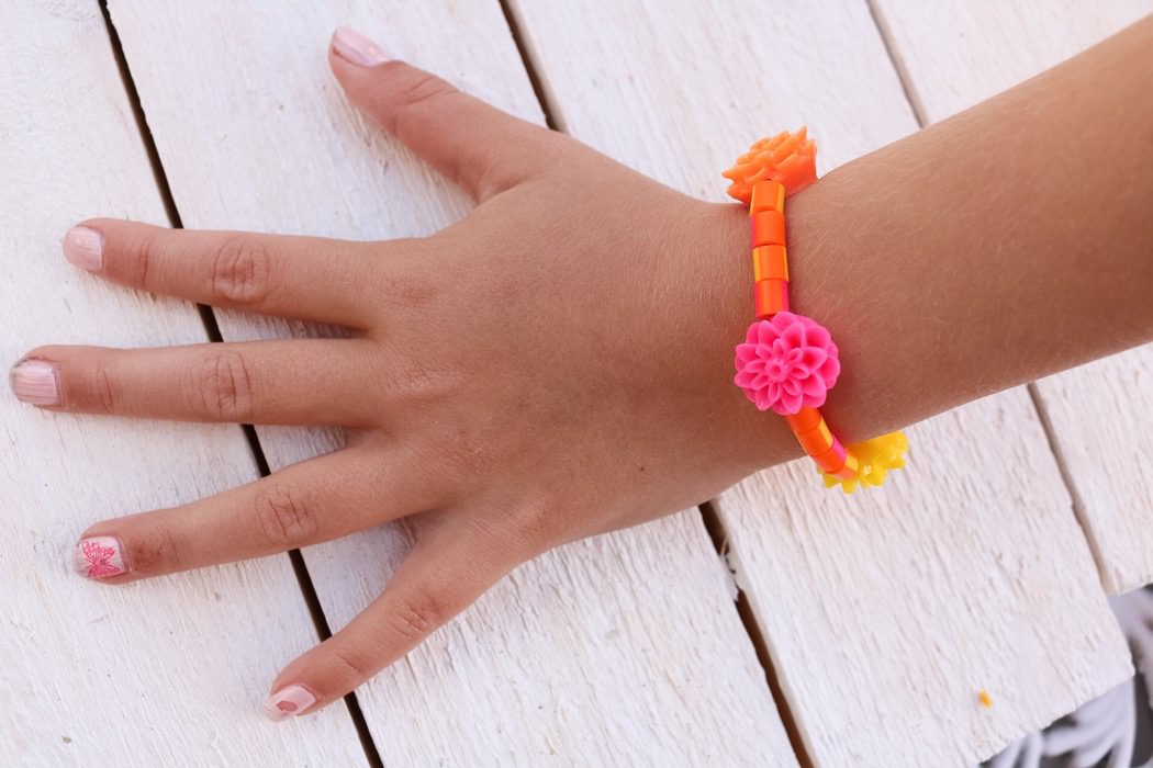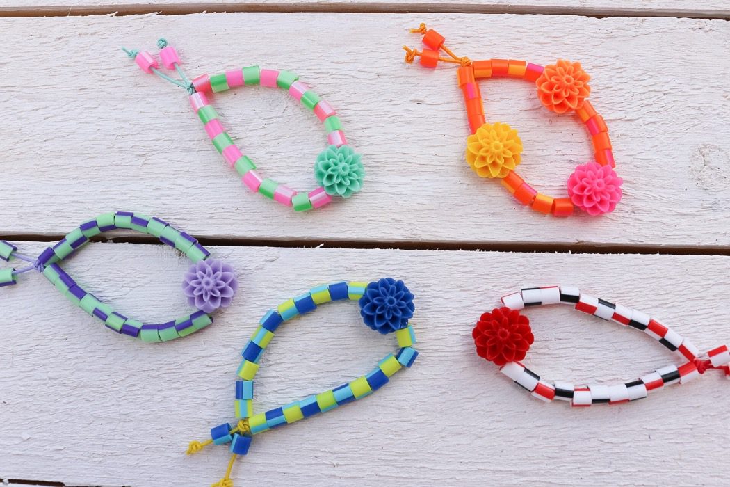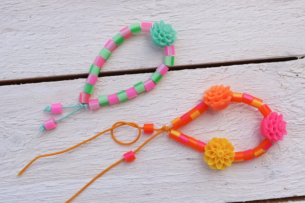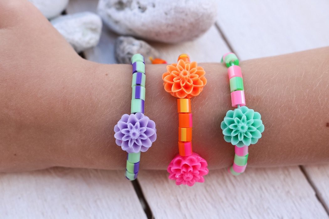 Det är så enkelt och kul att göra armband med rörpärlor och gummiband, ett bra pyssel för de minsta. De allra minsta kan pärla hur de vill! De lite större får träna sig att bara sitta still och koncentrera sig en stund, lära sig knyta knutar, räkna hur många pärlor som ska vara på var sida om blomman, och även testa att ta varannan pärla i olika färger. Ett toppensommarpyssel att ta med till sommarstugan.
