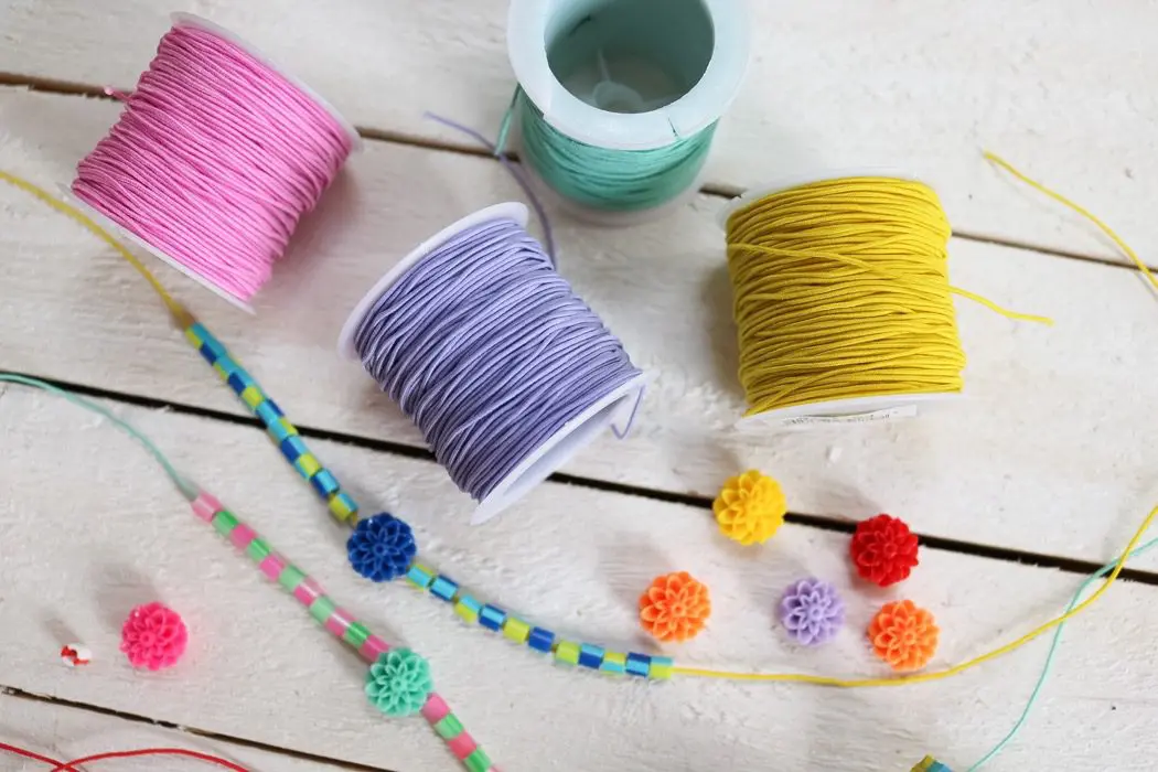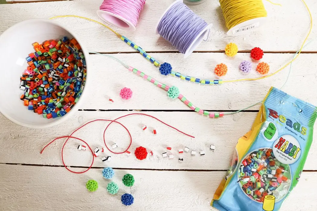 - För att göra det enkelt för de allra minsta barnen, så kan man först trä på blompärlan, sedan göra en knut på var sida av blomman, och sedan trä pärlor på ena sidan och därefter den andra sidan.