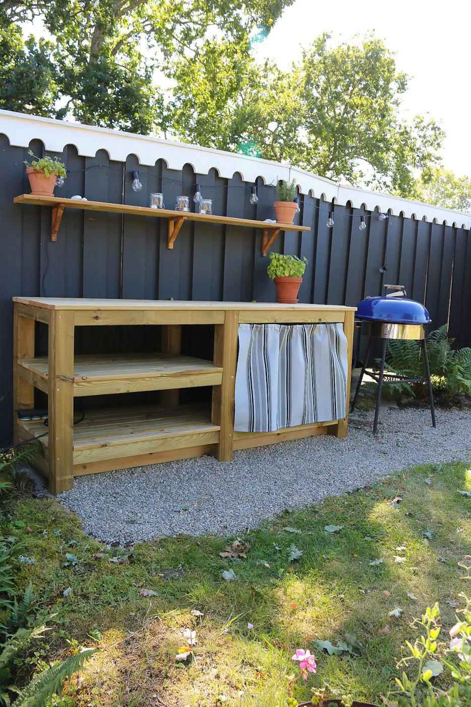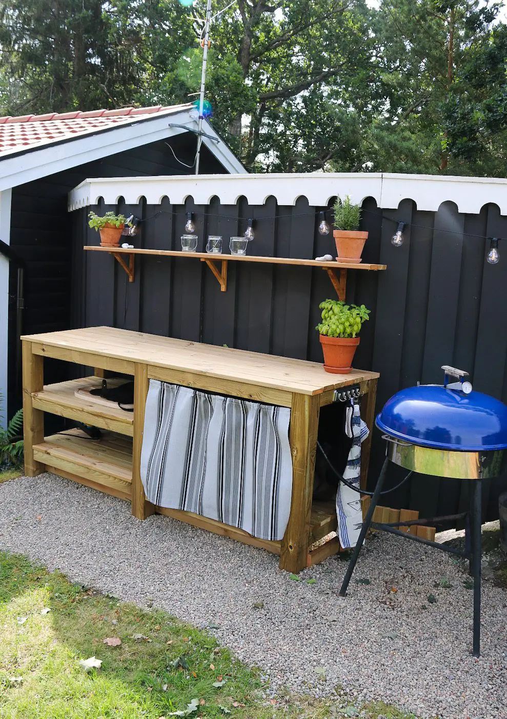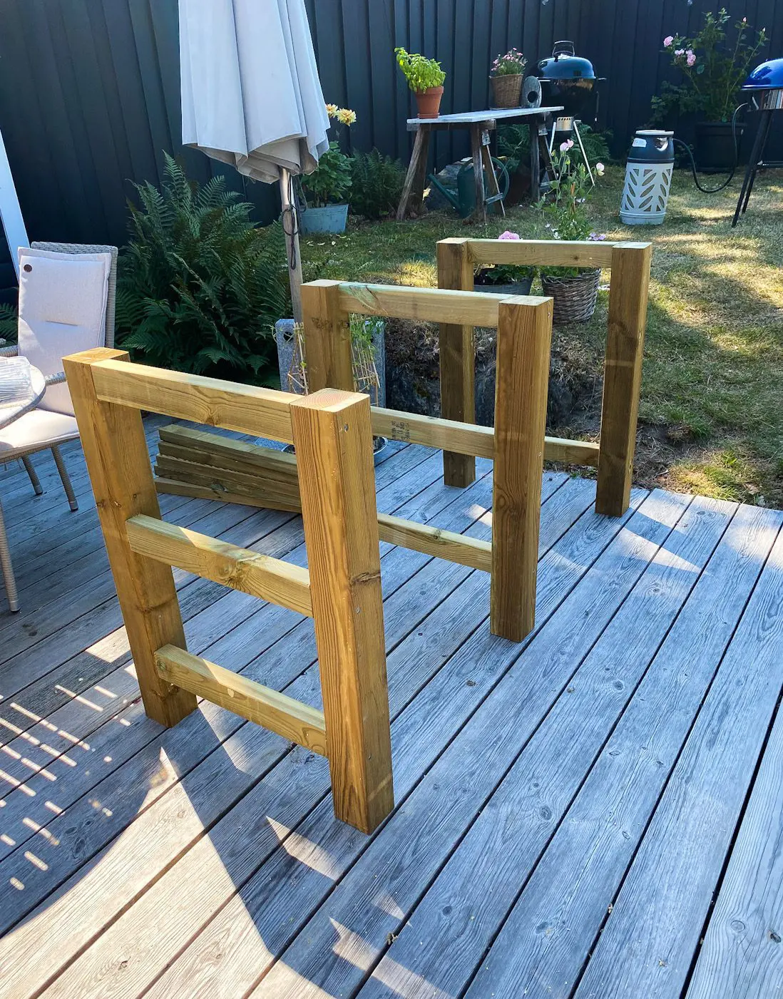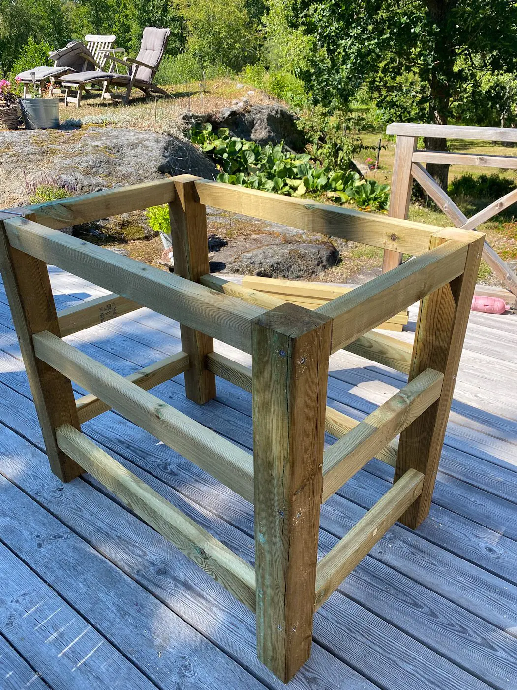💙Tryckinpregnerat trä fick det bli, som grånar fint med tiden, samt kan stå ute året om! Det sägs att man inte ska ha det som toppskiva till utekök, men vi har skärbräda och brickor och skär aldrig något direkt på bänken, funkar toppen!