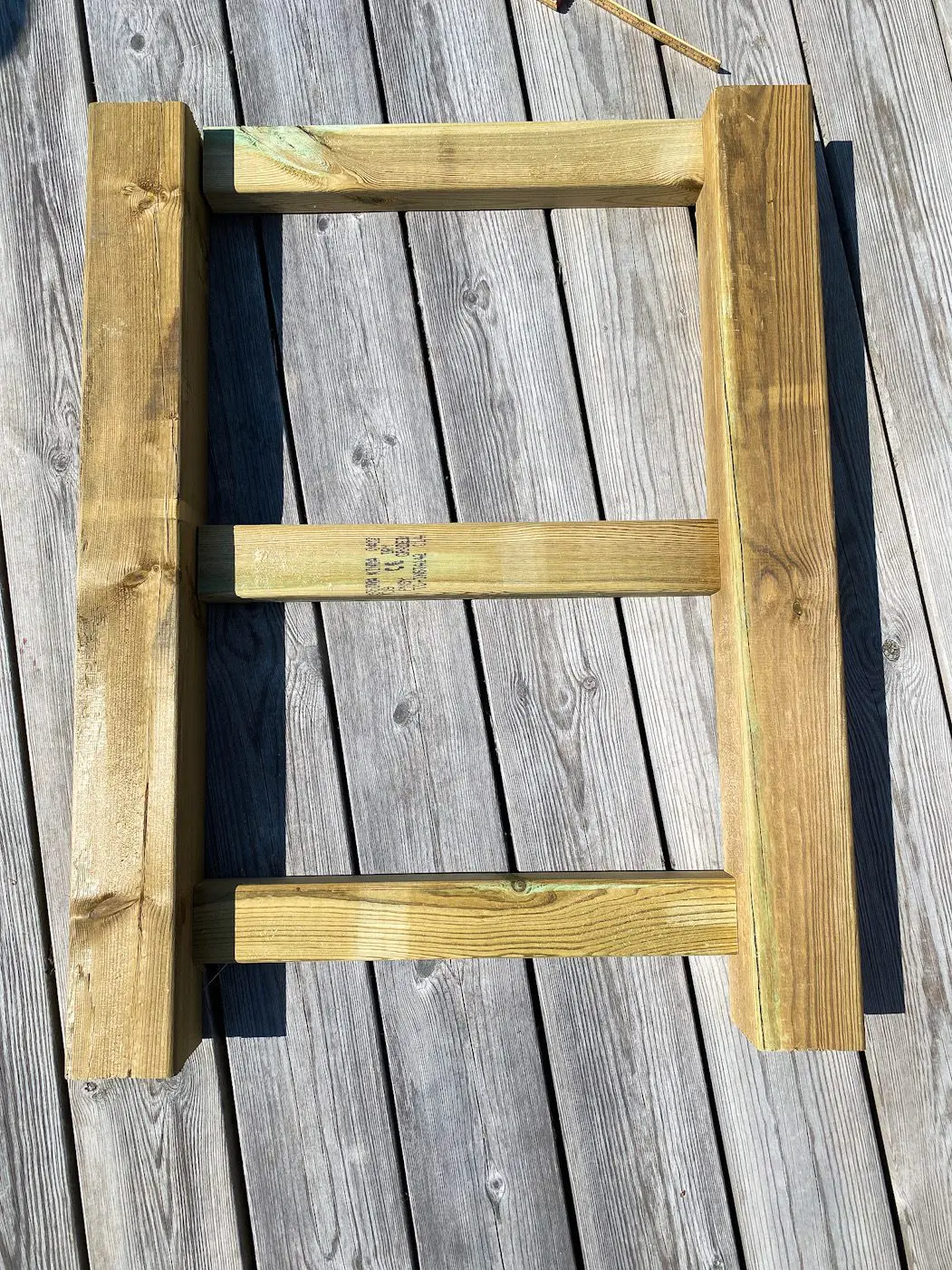 3. Skruva först ihop stommen ordentligt. Det är bra att ha ett plant underlag så allt blir rakt. ( Se på högra bilden vad vi haft tidigare som “utekök” några bockar och en skiva)