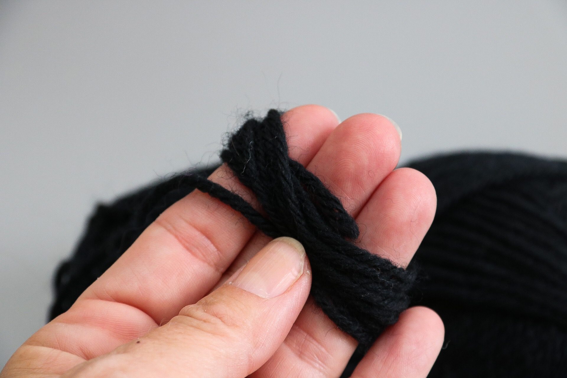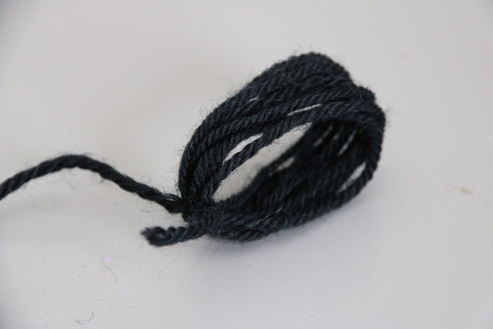 3) Tag en till bit garn och vira några nära ena änden av garnhärvan. Knyt så att tofsen håller ihop.