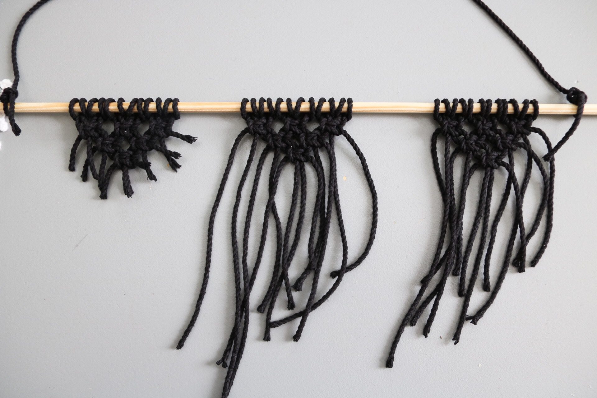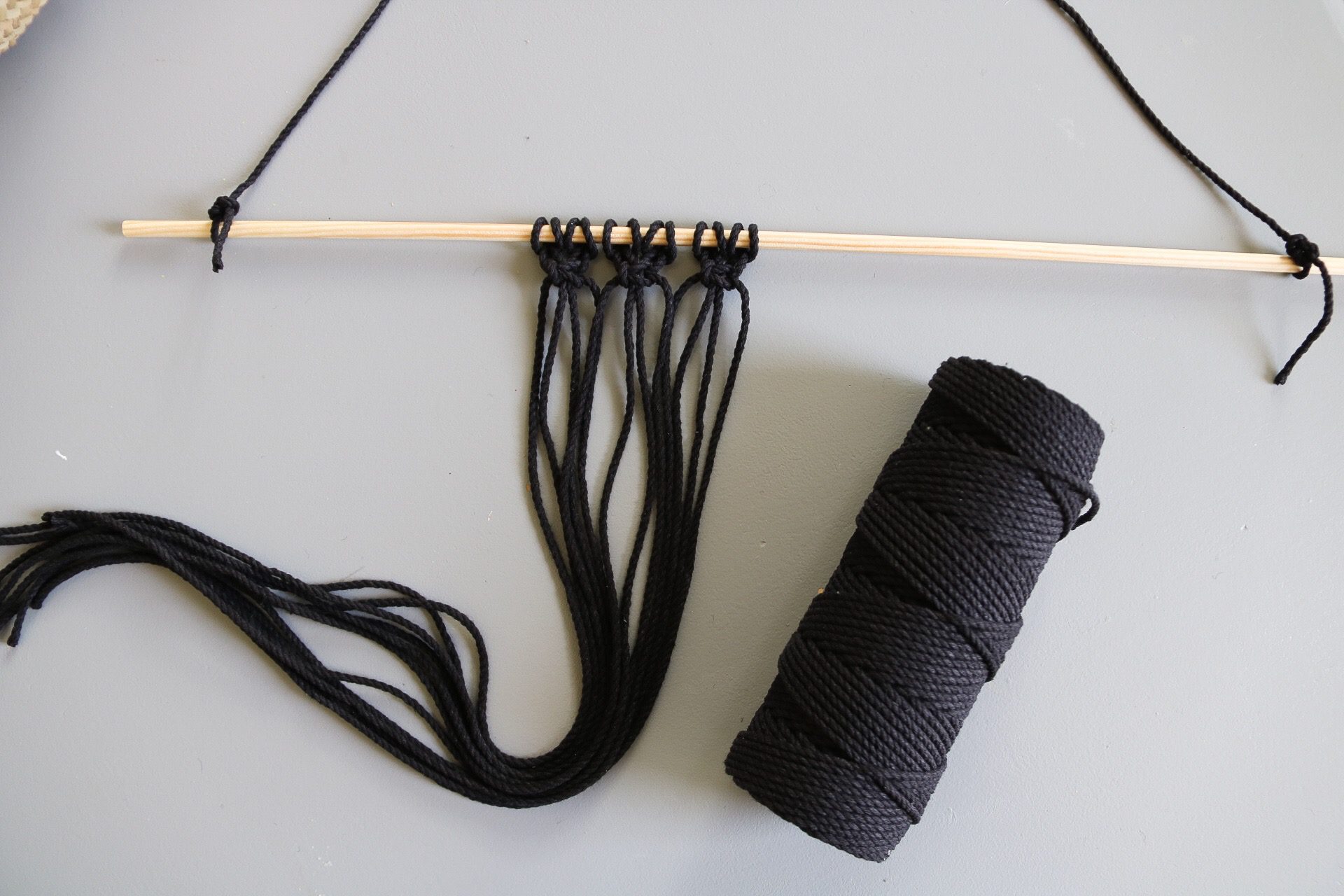 För att göra makramévimplarna har jag använt 2 mm knytgarn och en vanlig blompinne.