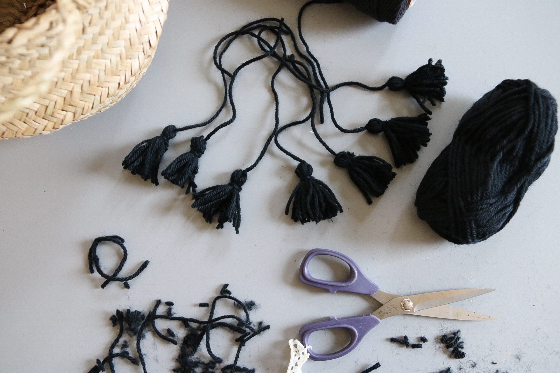 5) Klipp av tofsarnas hängen, limma fast eller sy fast tofsarna på korgen.