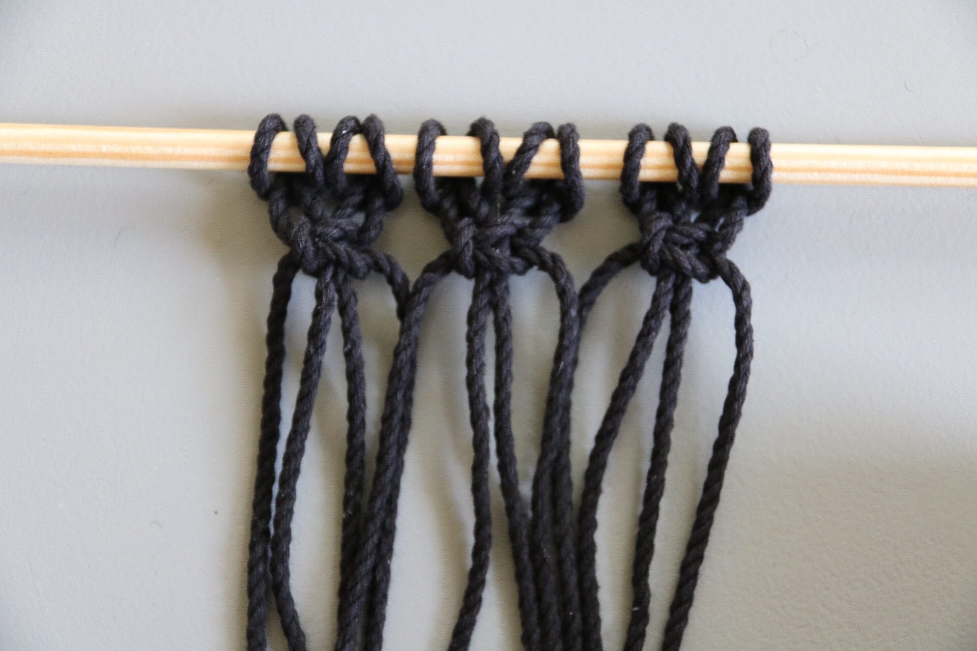 3) Knyt 2 st ”square knots” mellan de tre, och till sist en knut längs ned, så att det blir en vimpel.