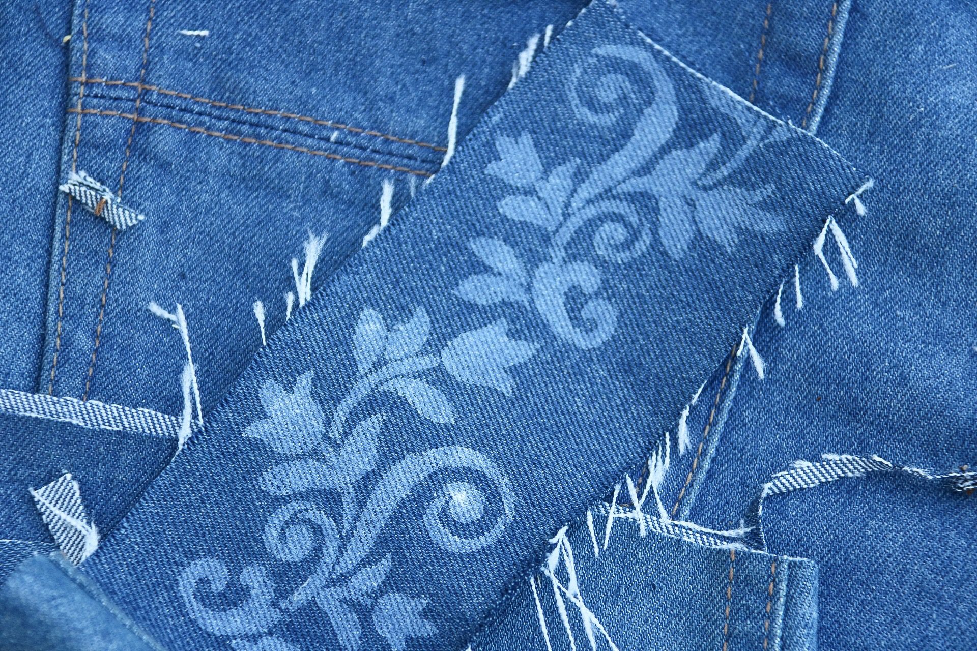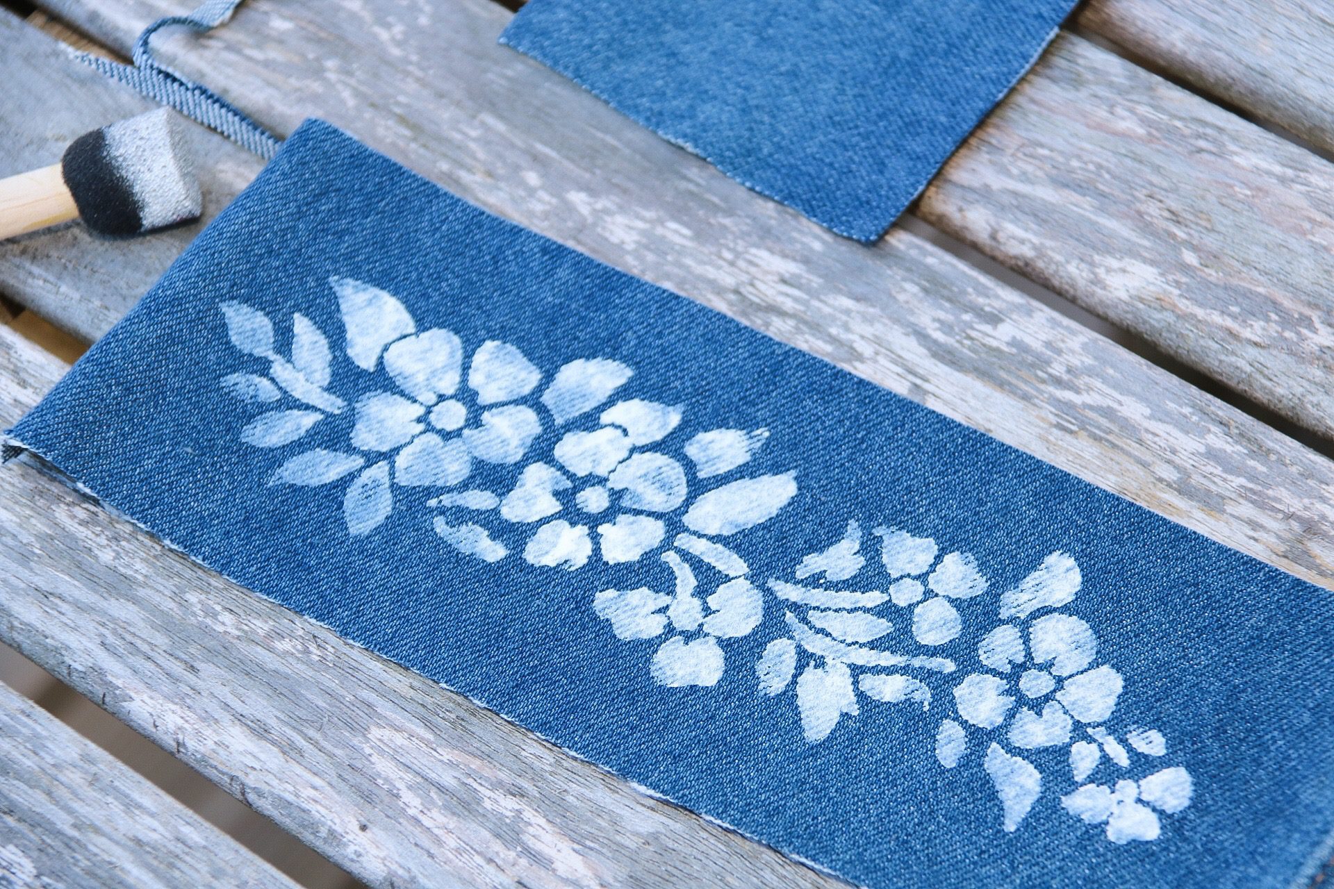 Ett kul återbrukspyssel, så bra att kunna använda gamla jeans! Jag tycker att det blev fint med den vita färgen till det jeansblå! Jag fransade jeanskanterna, så det skulle kännas mer lantligt och rufft. Att pyssla med schablon och textil färg är enkelt och väldigt roligt! Vi kom igång att måla på fri hand och testa massa annat att trycka med!