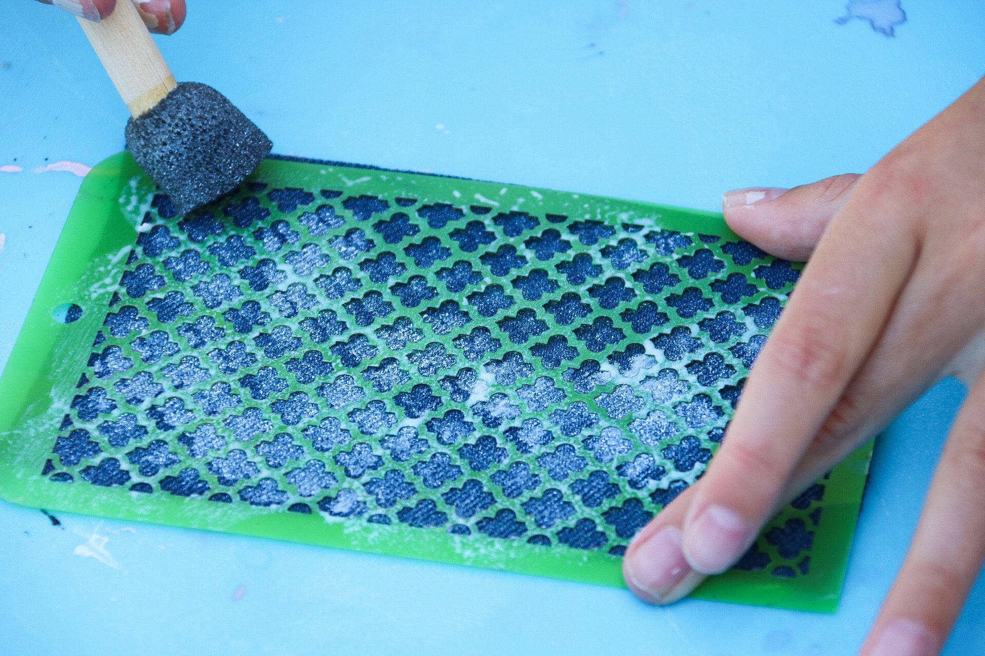 2) Det finns olika slags schabloner. Den på bild 2 är en självhäftande schablon, som fäster Väldigt bra på alla slags material. Den går att återanvända många gånger, och mönstret blir skarpt vid textiltryck. Schablonen på bild 4, är en hårdare plastschablon, som är väldigt hållbar och kan återanvändas massor av gånger. Den fäster man med lite tejp, funkar också himla bra på alla material.