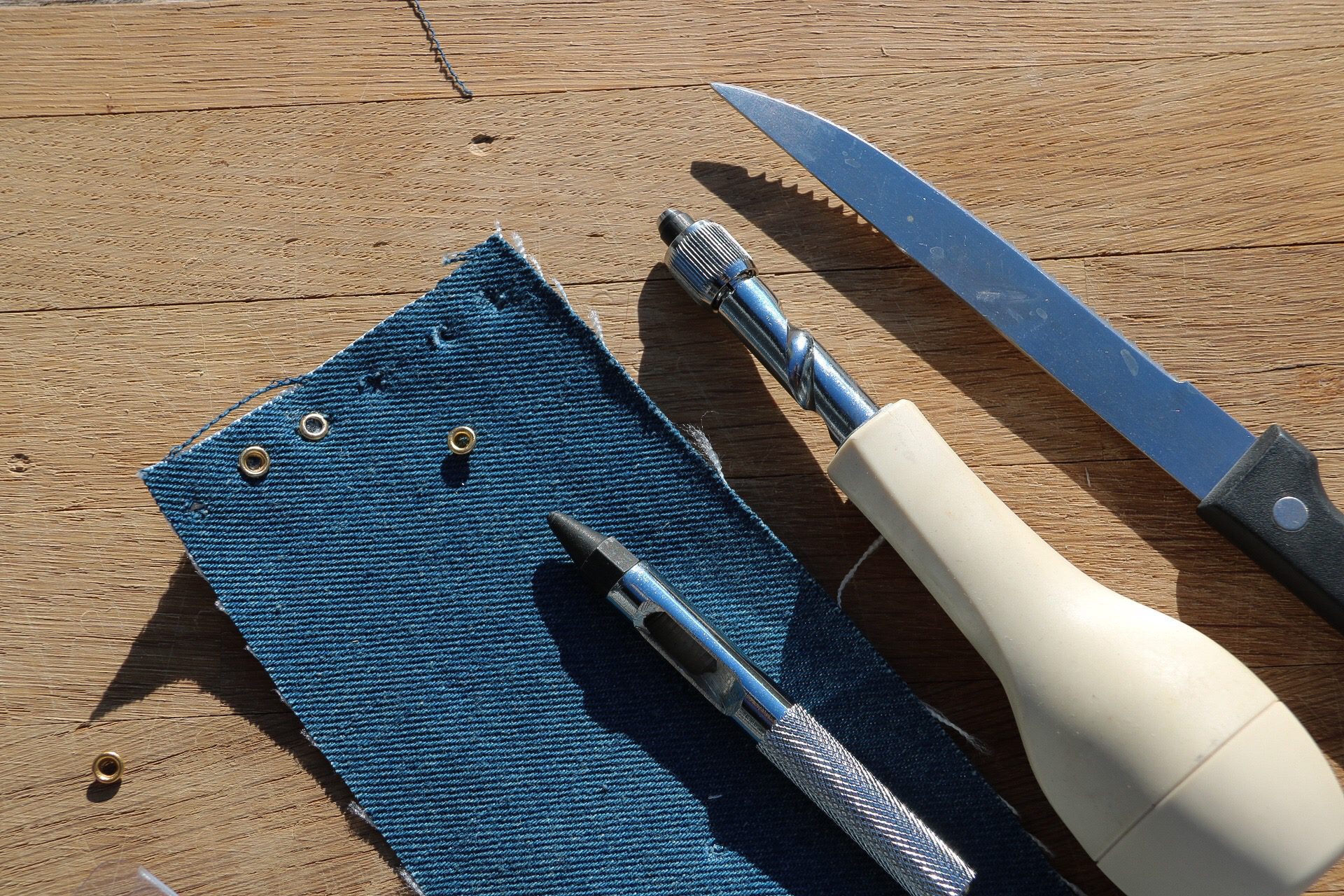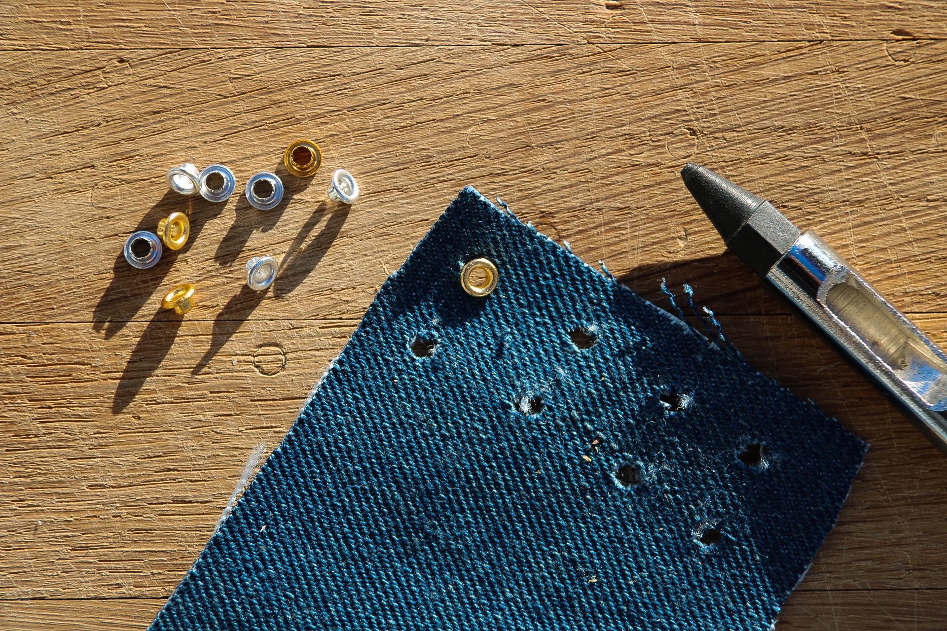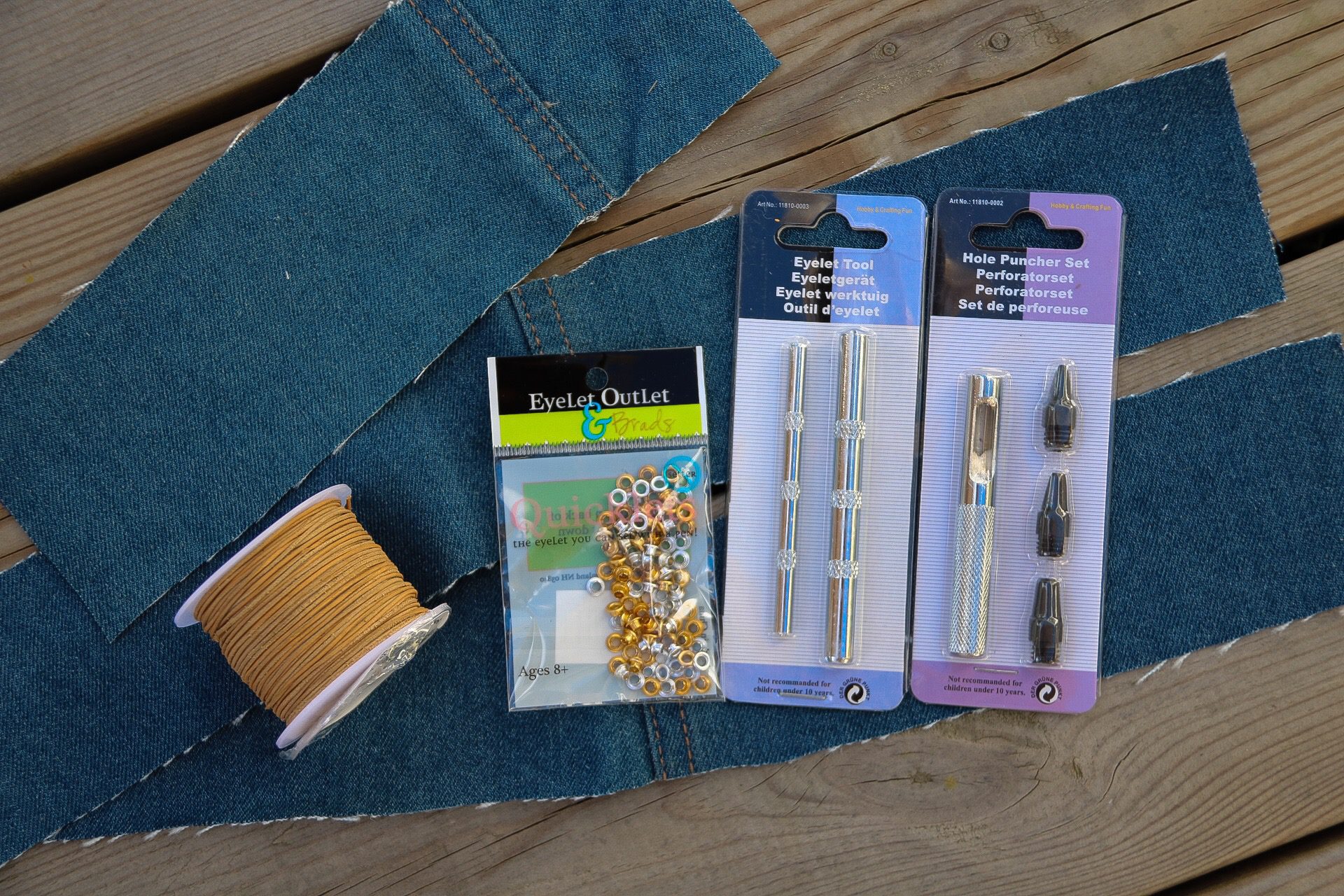 Jag tänkte det skulle vara fint att blanda in guldiga öljetter och brunt lädersnöre till jeanstyget. Det är mycket enklare att sätta fast öljetter i tyg än vad man kan tro. Den här typen av öljetter ska man enkelt kunna sätt fast med bara en pennas tryck. Men eftersom jag ville få fast dem i jeanstyg, så använde jag ett holepunchverktyg och hammare, för att dunka fast öljetterna.