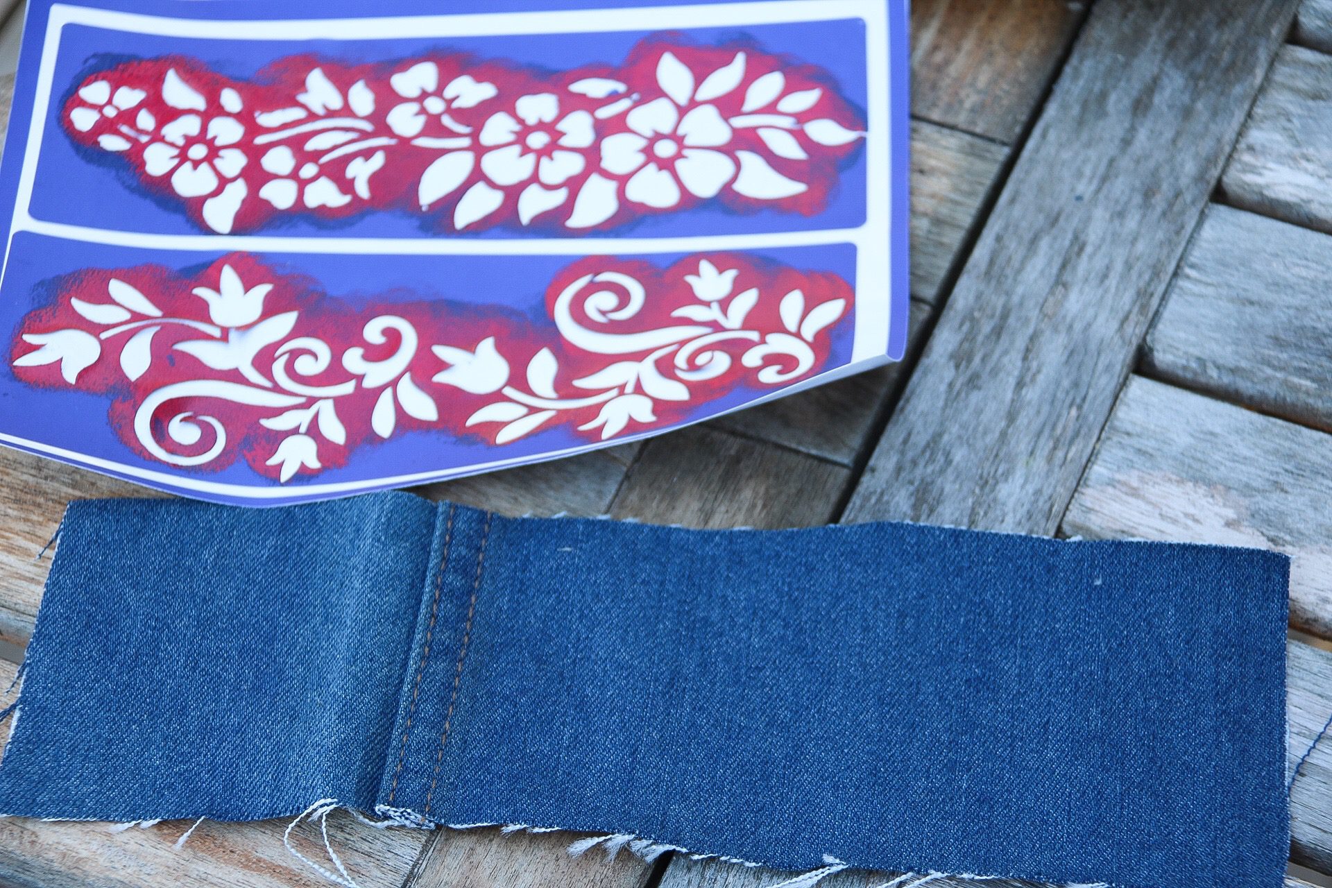 1) Plocka fram textilfärg, jeanstyg (eller annat tyg), schabloner, en papptallrik till färgen och en sax.