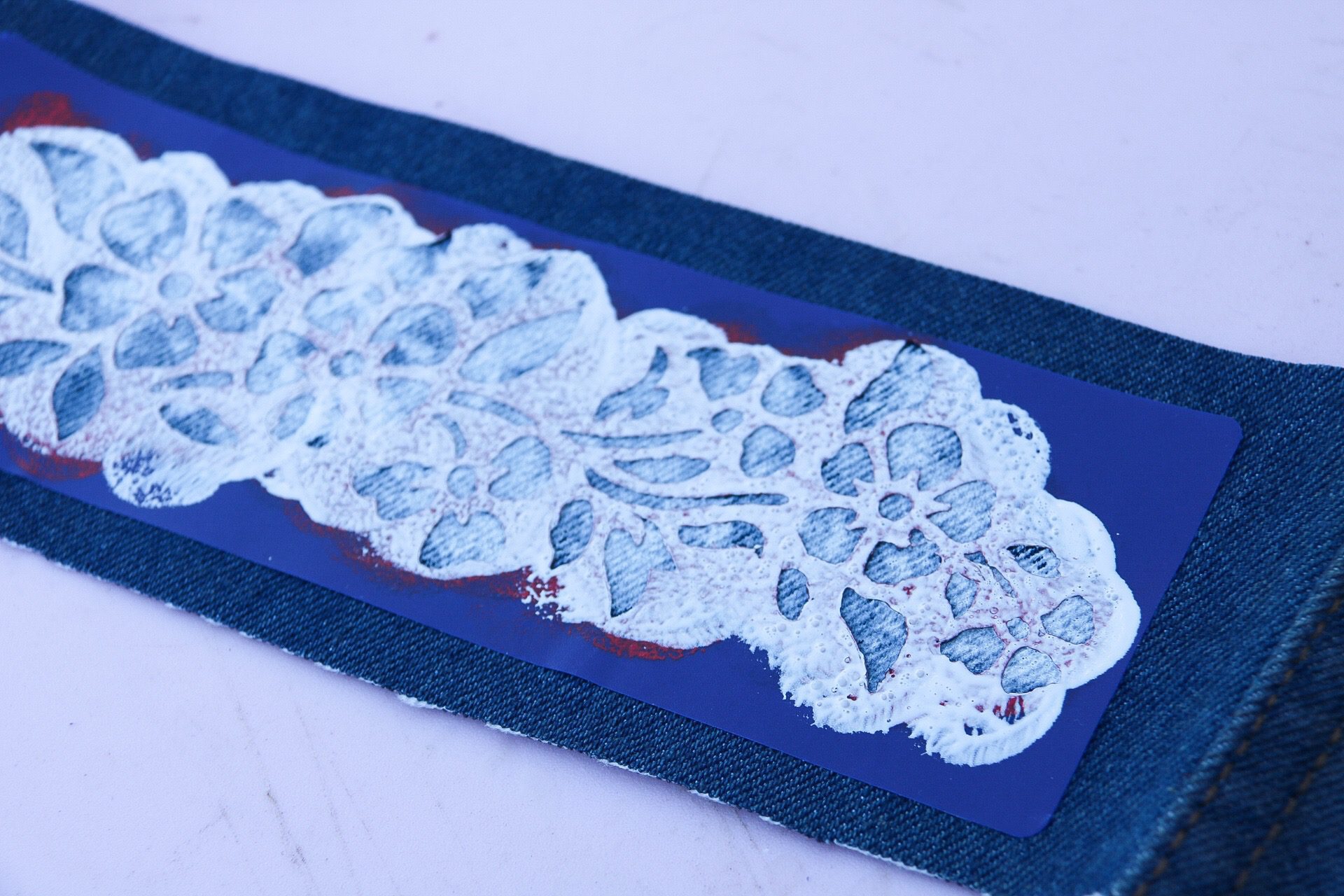 3) Klipp till en bit jeanstyg, som ska passa att sätta fast kring burken. Häll upp färg på en papptallrik, använd stöpplaren för att dutta på färg på stencilen/tygbit. Vill man att färgen ska framträda mycket, måste man först tvätta tyget och använda mycket färg vid tryckning/målning. Jag var lite försiktig med färgen, eftersom jag inte visst om den skulle flyta utanför stencilen, men kunde nog tagit mer färg. Jag tycker det blev fint ändå när färgen trängde in i jeanstyget, resultatet blev himla proffsigt!