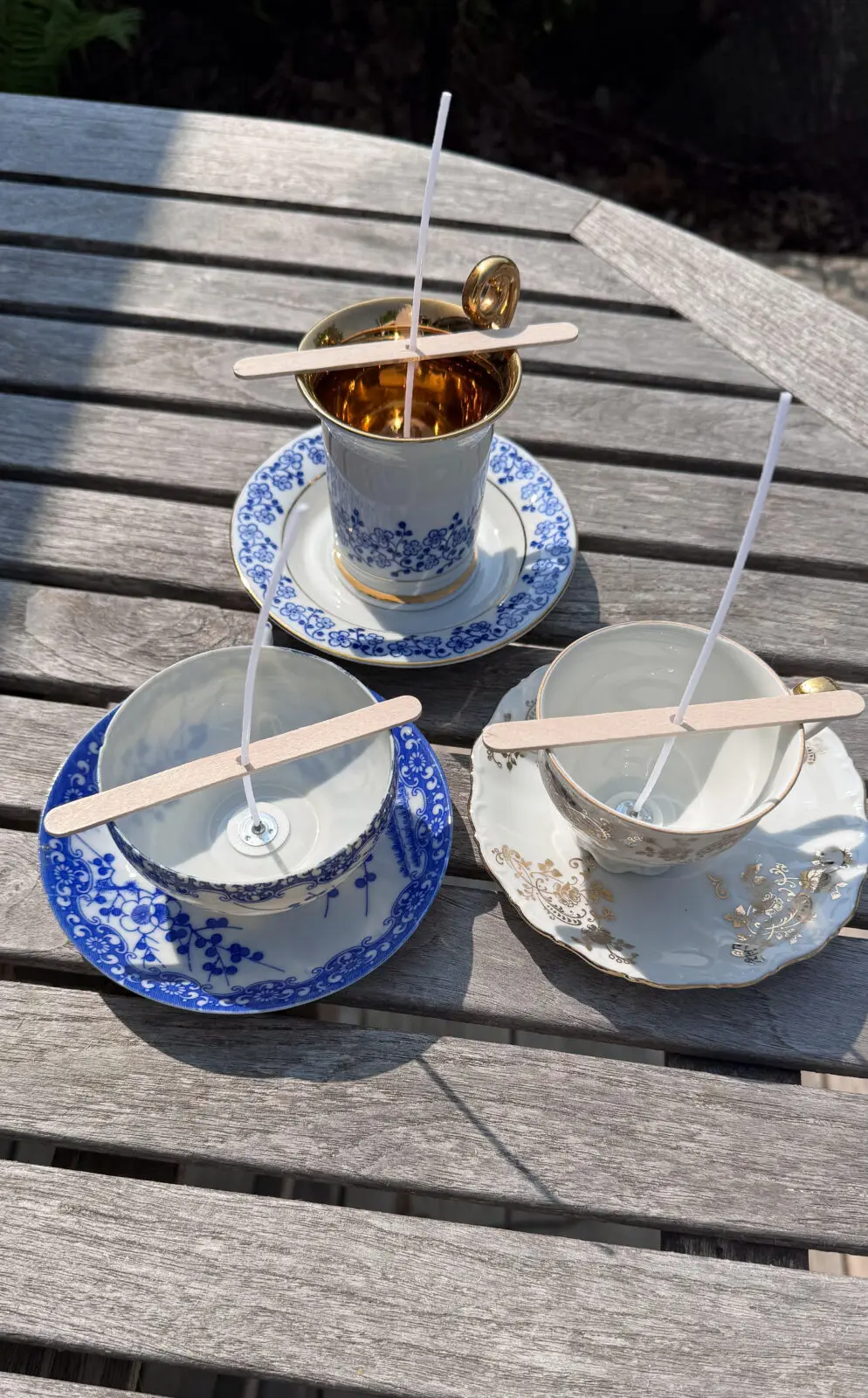 Välj ut dina loppisfynd – ju personligare desto bättre! Se till att de är rena och torra. Sätt fast veken i mitten med hjälp av lite smält ljusmassa eller en vekhållare i metall (den kan sättas fast med dubbelhäftande tejp). Linda övre delen av veken runt en pinne som du lägger tvärs över formen för att hålla den rak.
