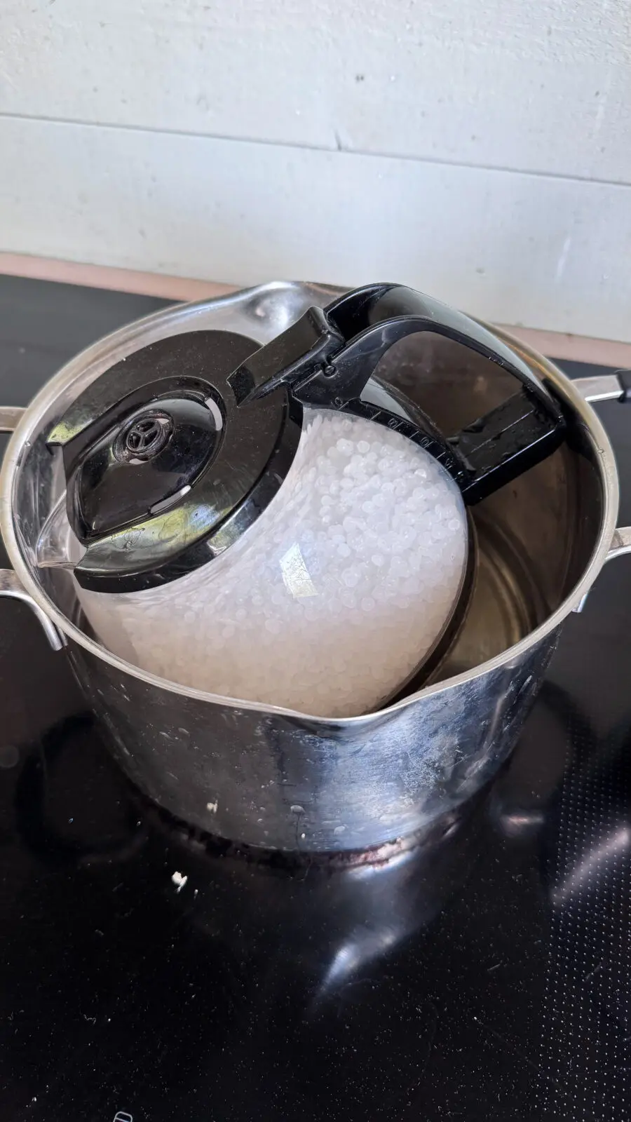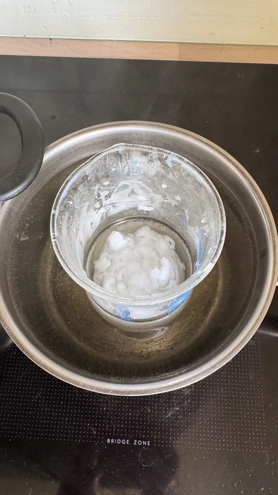 Verktyg: Gryta + värmetålig kanna (eller dubbla kastruller till vattenbad) Man kan även använda en återbrukad glaskaffekanna, en konservburk eller en mjölkkartong för att smälta ljusmassa i.