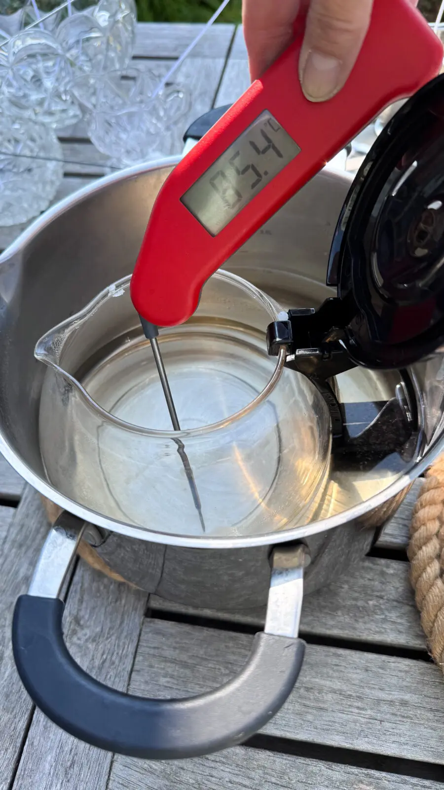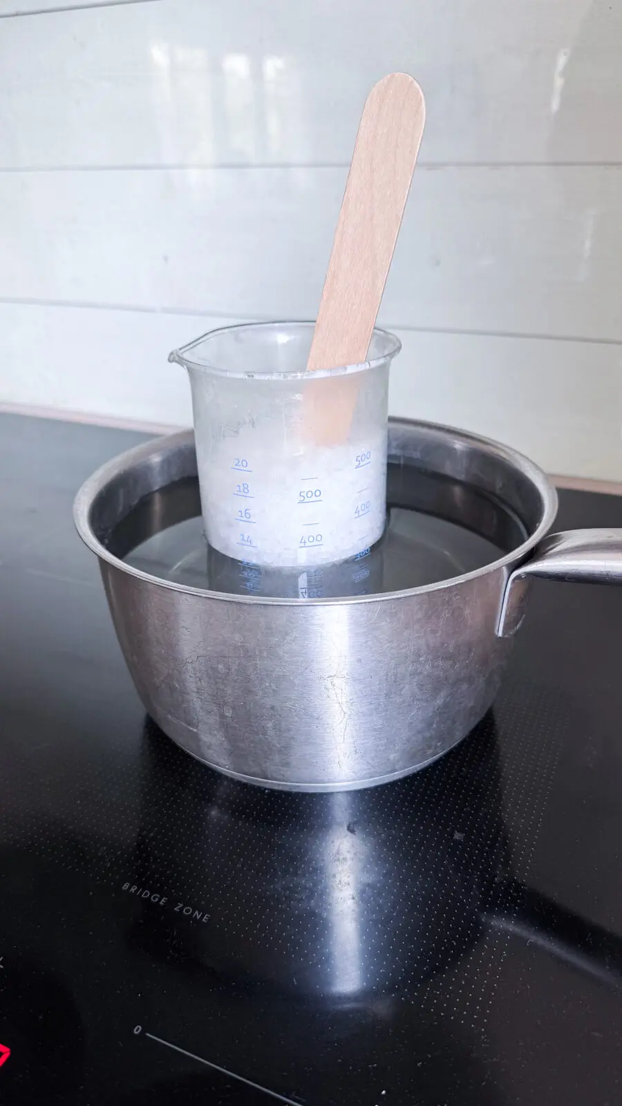 - Smält ljusmassan i vattenbad. Använd en värmetålig kanna, rör försiktigt och håll koll på temperaturen – ljusmassan ska inte bli för varm, max 90 grader.