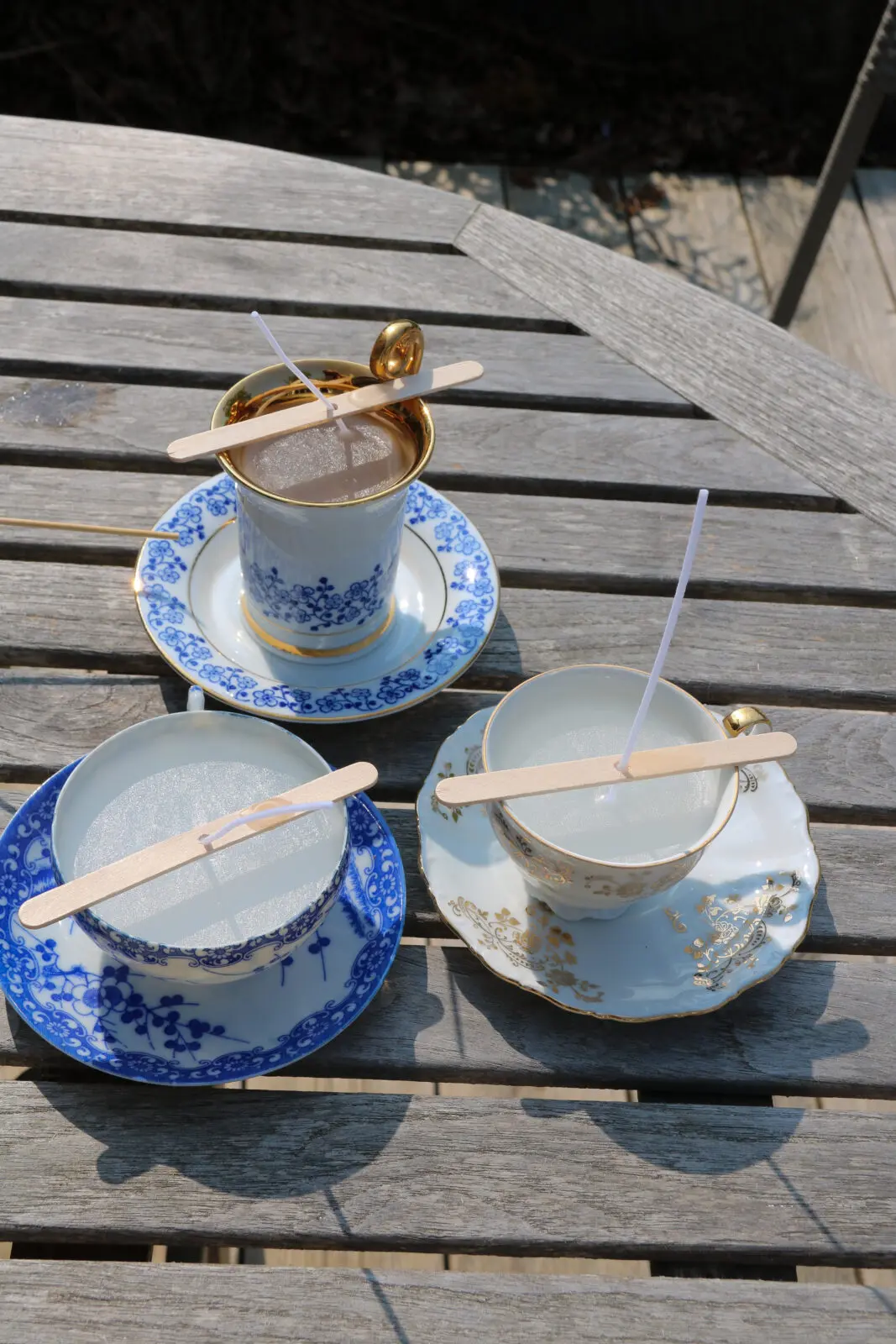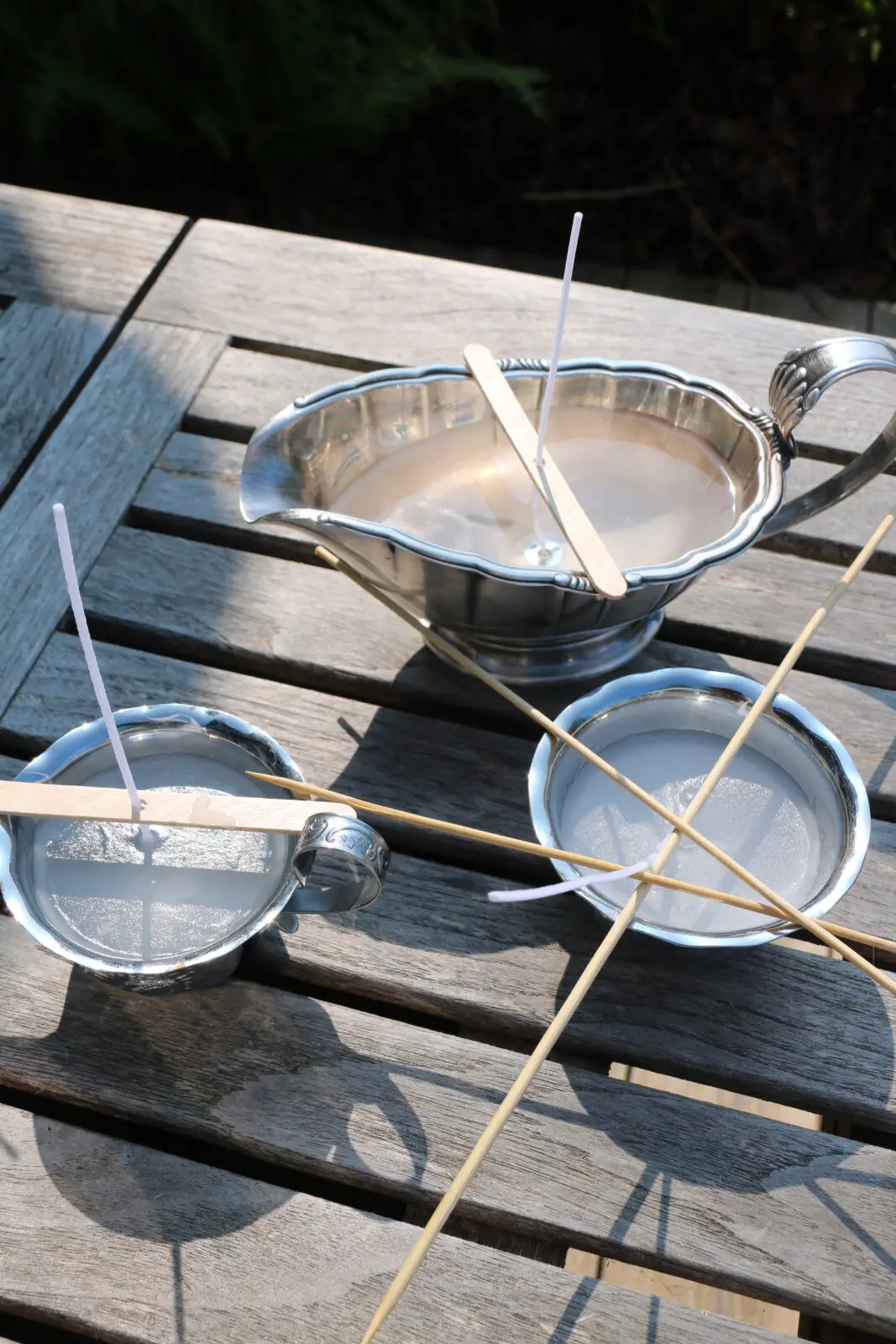 När ljusmassan smält helt, häll den försiktigt i dina loppisformar. Håll veken på plats. Låt ljusen stelna i rumstemperatur, det tar några timmar beroende på storlek.