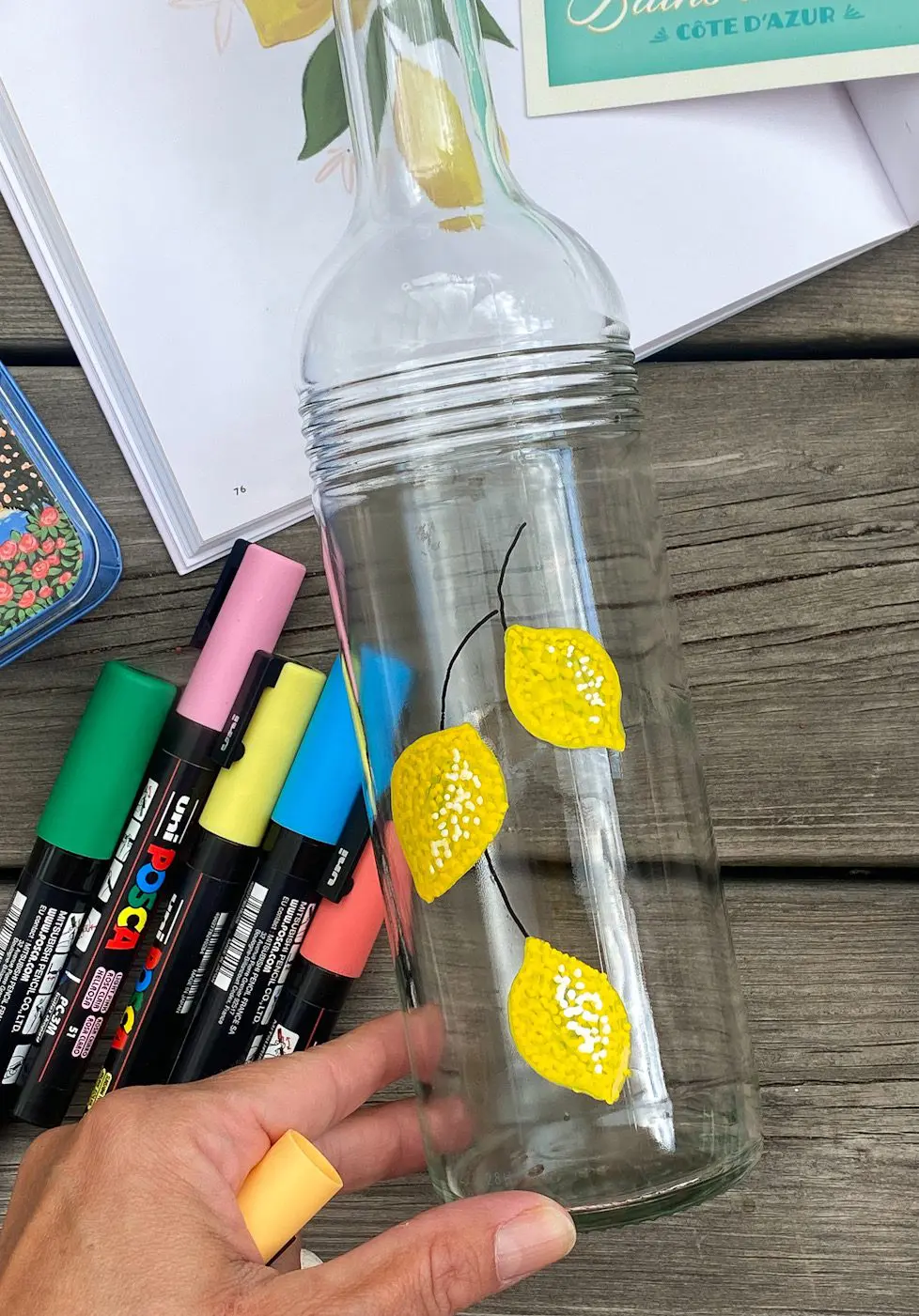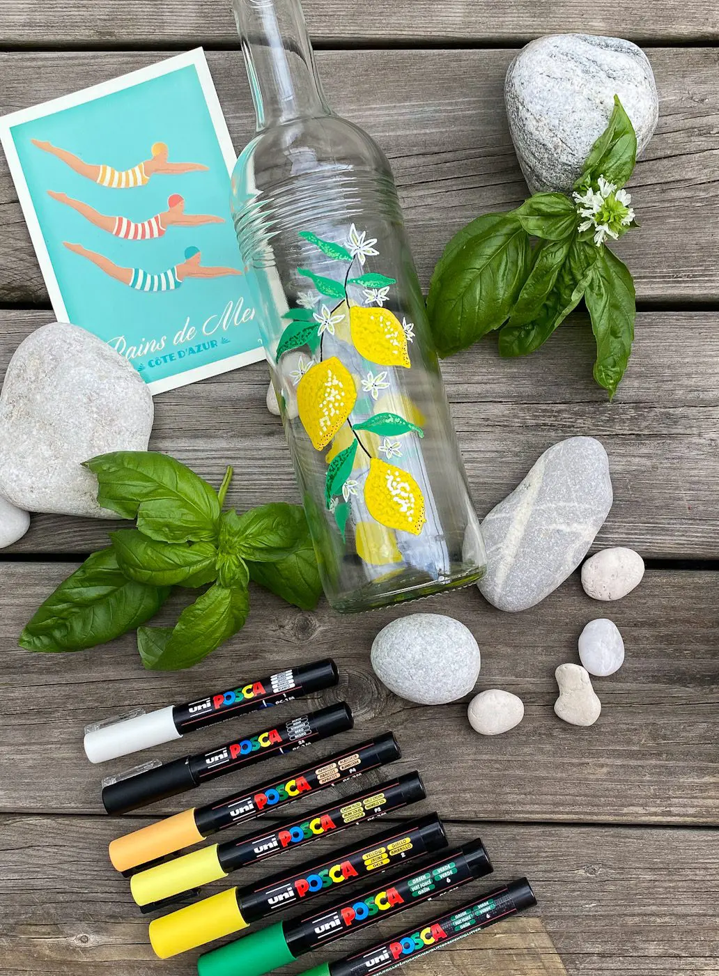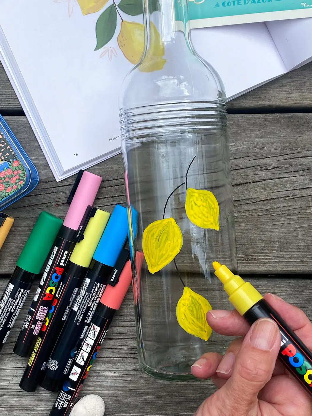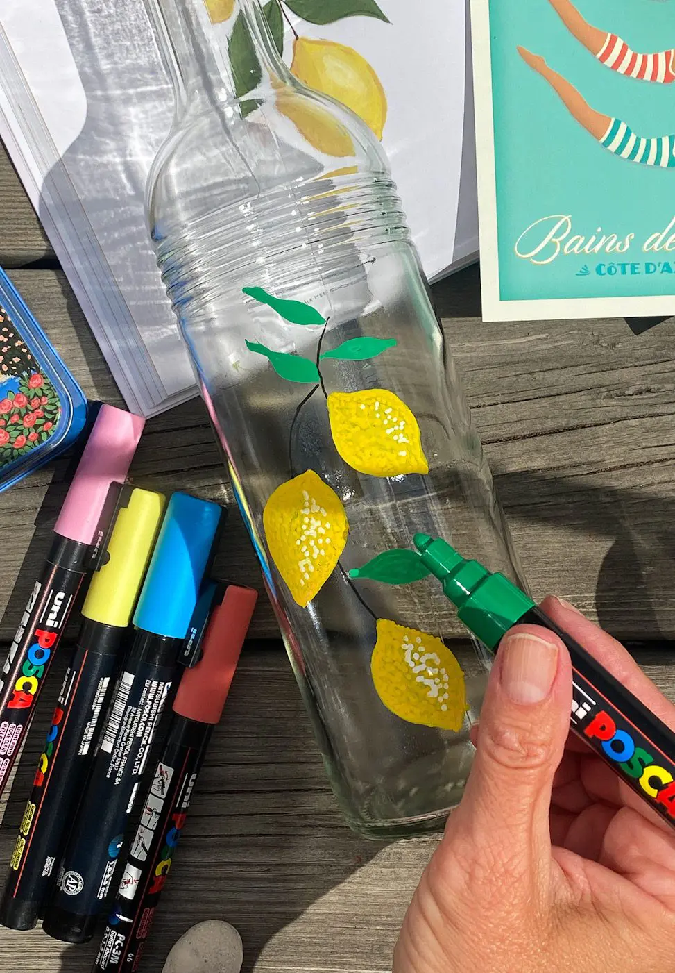 Idag bjuder jag på ett härlig sommarpyssel av återbrukade glasflaskor och poscapennor! Vi var på semester i Frankrike i förra veckan och då inspirerades jag av de vackra vattenflaskorna som alltid fanns på bordet. De var återbrukade vinflaskor som någon berömd designer dekorerat…det här borde ju vara ett toppensommarpyssel som passar liten som stor. Designa din egen glasflaska fyll med iskallt vatten, färska bär, sommarens saft och massor av is! Varsågoda här är dagens pyssel: Poscapennor sommardiy