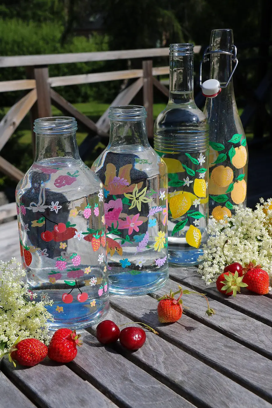 Då var det dax för nästa variant av flaska blommor samt bär. Tänkte att de skulle passa fint till sommarsaften, lite mer naivt måleri! En dekorerad flaska med hemgjord saft, är ju en toppen gåbortpresent!