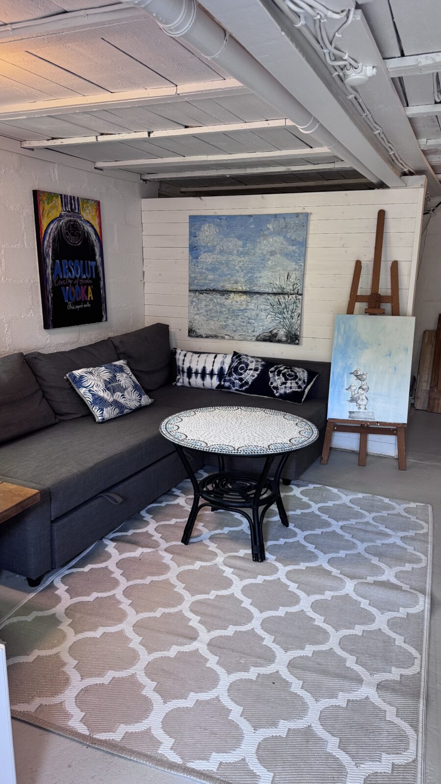 Här är min lilla keramikverkstad, med plats för kavling av lera, en drejskiva samt några platser för att skapa fritt för leran. Sen är källaren även fylld med en del pysselmaterial. Egentligen jag inte hunnit fixa klart i verkstan riktigt…har tänkt att den ska funka för fler platser att skapa med lera, med möjligheter för andra sorts pyssel också…men om jag märker att det finns intresse, så ska jag såklart lägga in fler bänkskivor och hyllor! Tycker att det är mysigt att ha kvar bäddsoffan, bra för övernattning samt att kunna sitta och fika, kolla inspirationsböcker och pyssla med små saker kring lilla mosaikbordet.