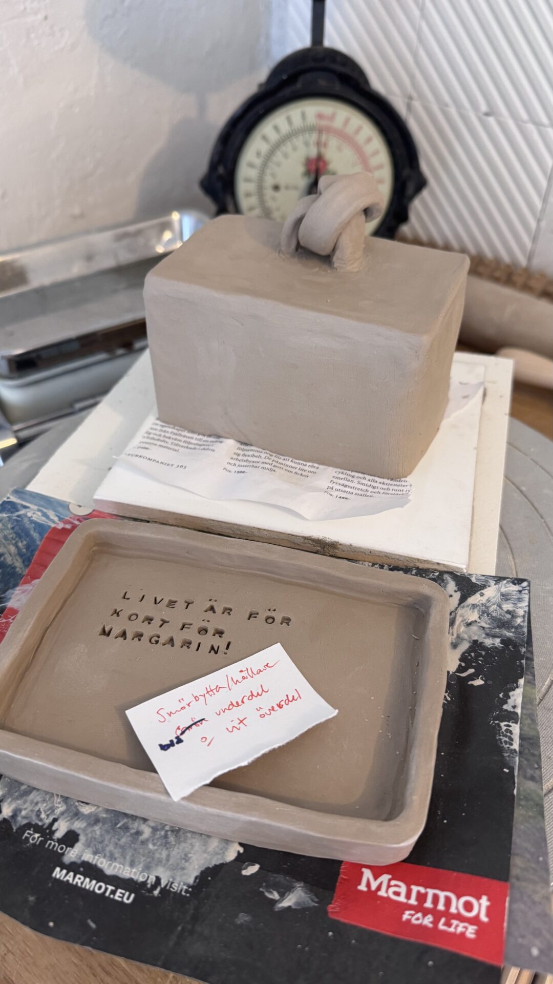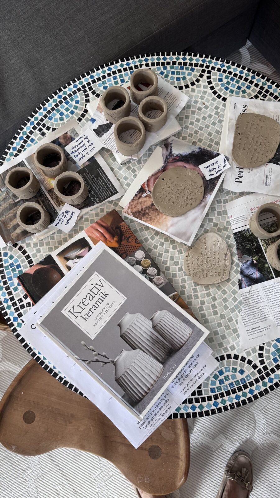 Min lilla grupp på fem personer, kändes som väldigt kreativa, men de hade nog inte provat på leran innan…så jag började med en kort intro om hur processen från lerklump till färdig keramik, med ugnsbränningar, glasering samt tips så att leran inte spricker. Min tanke är att de som hyr min stuga ska kunna få pyssla själva i lugn och ro, och prova sig fram. Det är enligt mig det bästa sättet att lära sig…och det finns massor av små filmer att kika på Youtube och Instagram/Tiktik o hur man skapar i lera.