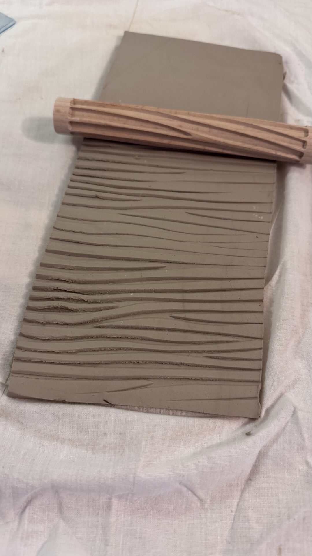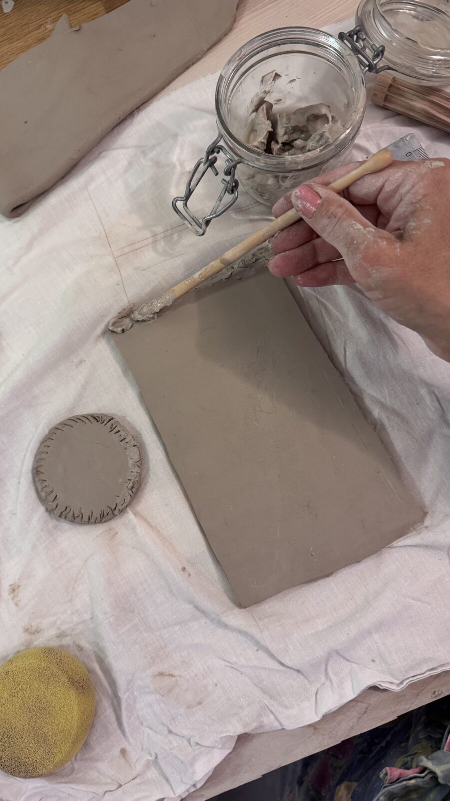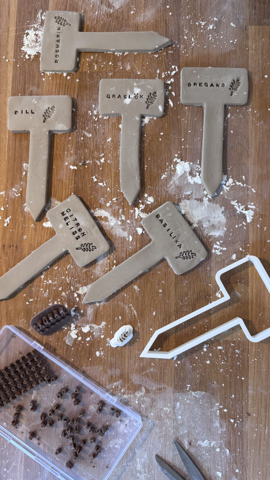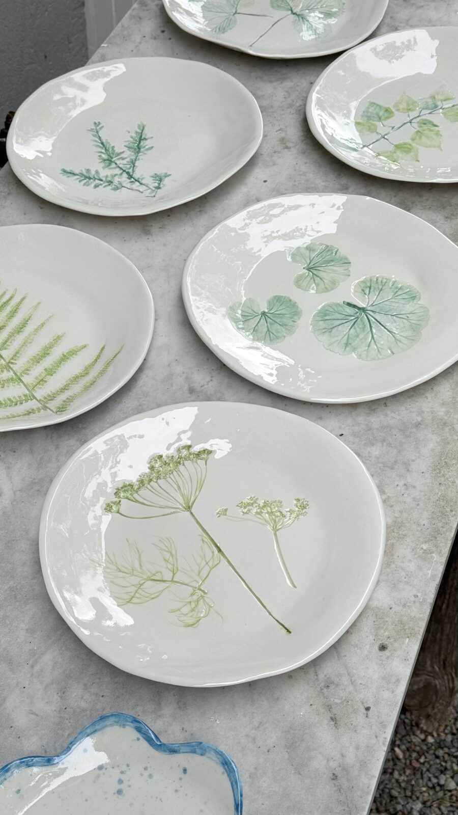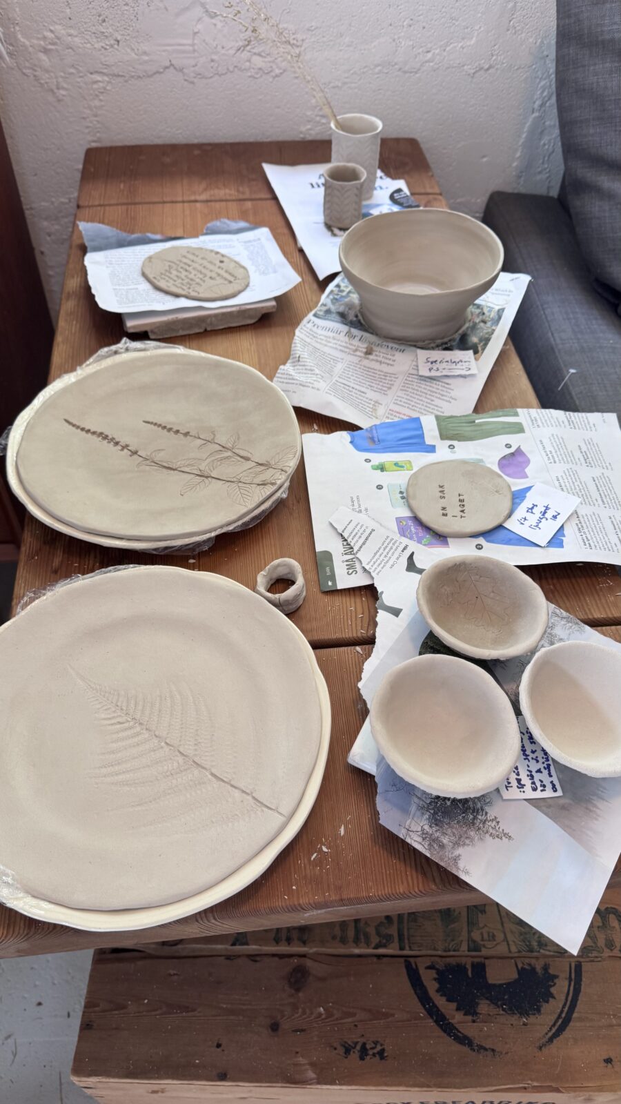 🌸 Jag visade det material som finns att använda i keramikverkstan. Kavlar, formar, spetsdukar, verktyg, lera, samt drejskiva. Sen kan man hämta tallrikar som formar i vårt kök, eller växter från trädgården för att göra mönster i leran.