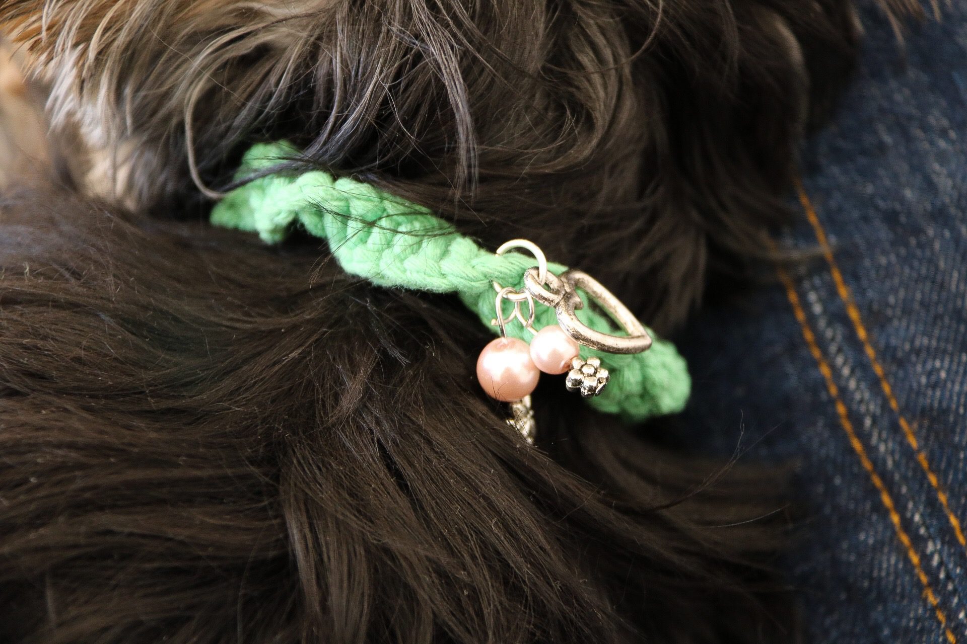 8) Sätt gärna fast en liten söt berlock på mitten av halsbandet, och gärna en liten metallring vid klickspännet, så att du har något att fästa kopplet. Klart!