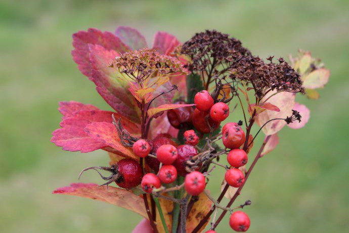 - Avsluta med att göra några småbuketter med röda blad, bär och blomställningar.