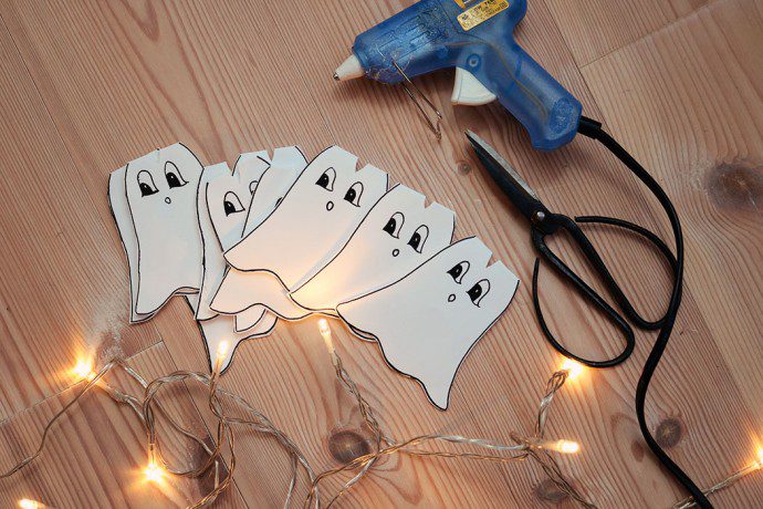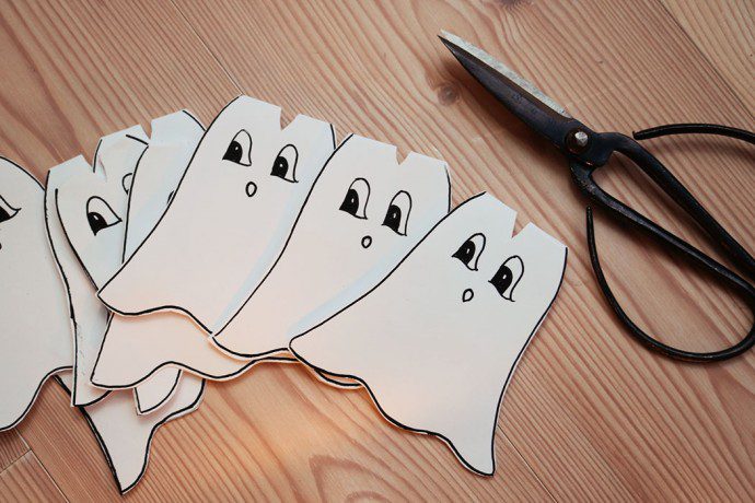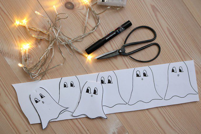 - Tryck dit spökena. Om du vill att slingan ska bli mer hållbar, så kan du limma fast spöken med limpistol. Man kan även limma ihop spökena nedtill. Klart att hänga upp!