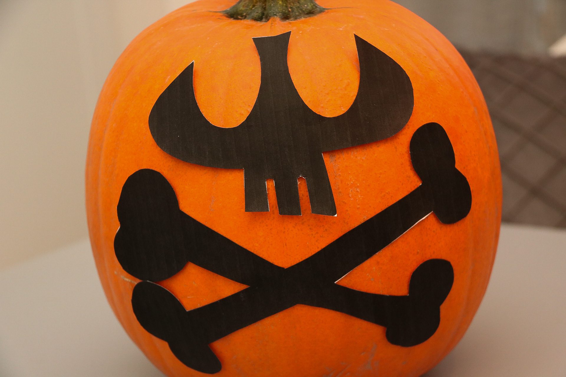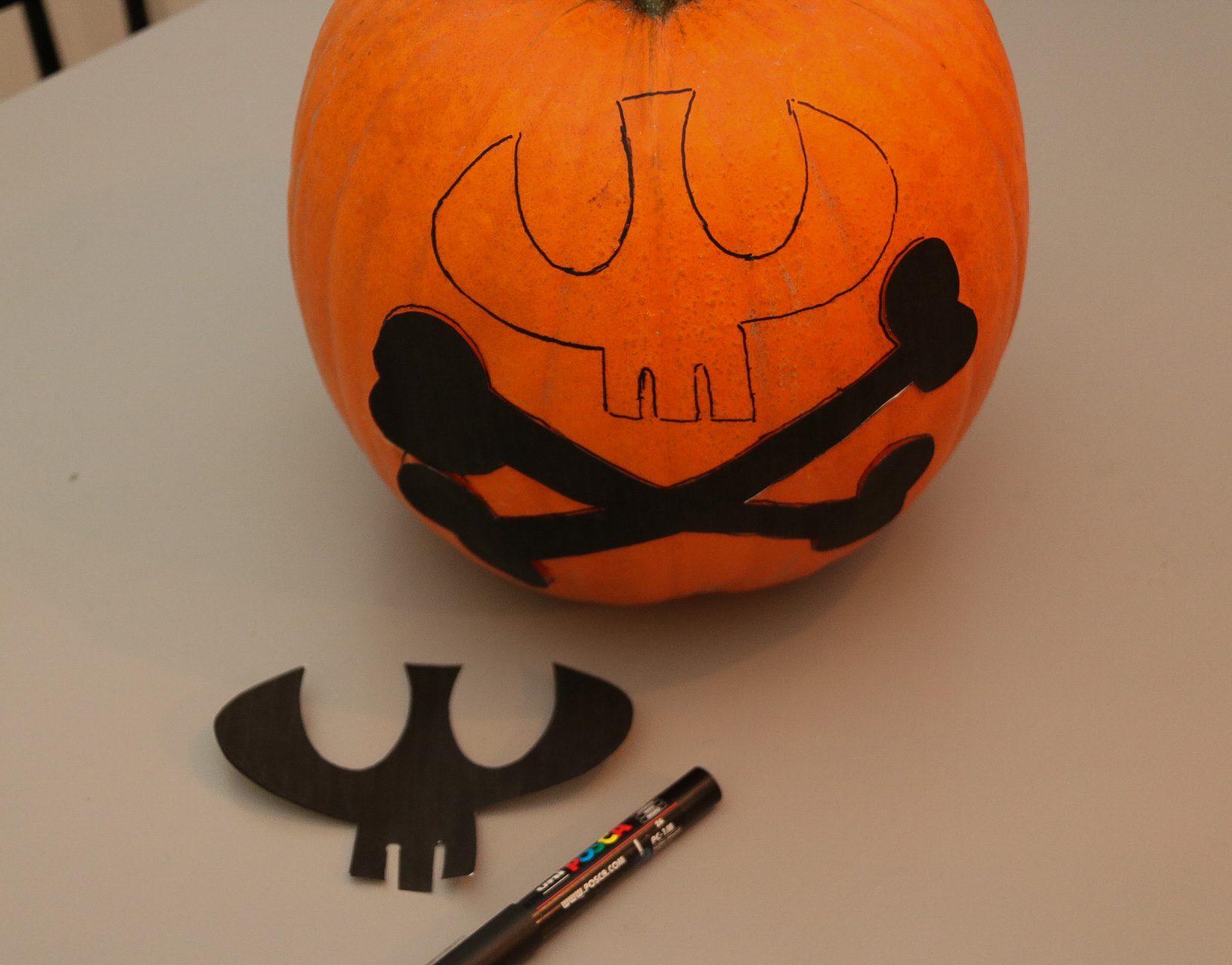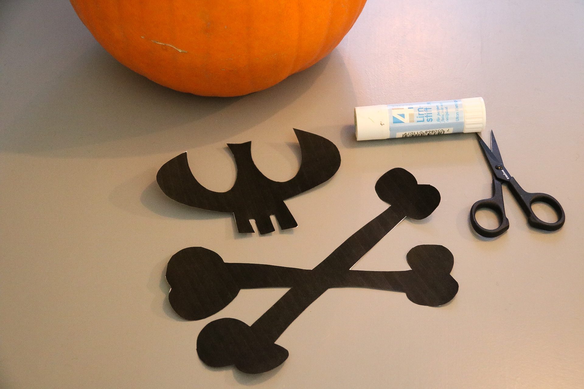 - Klipp ut motivet, limma fast med hjälp av ett limstift på pumpan. Vi valde döskallen, kändes minst läskigt…