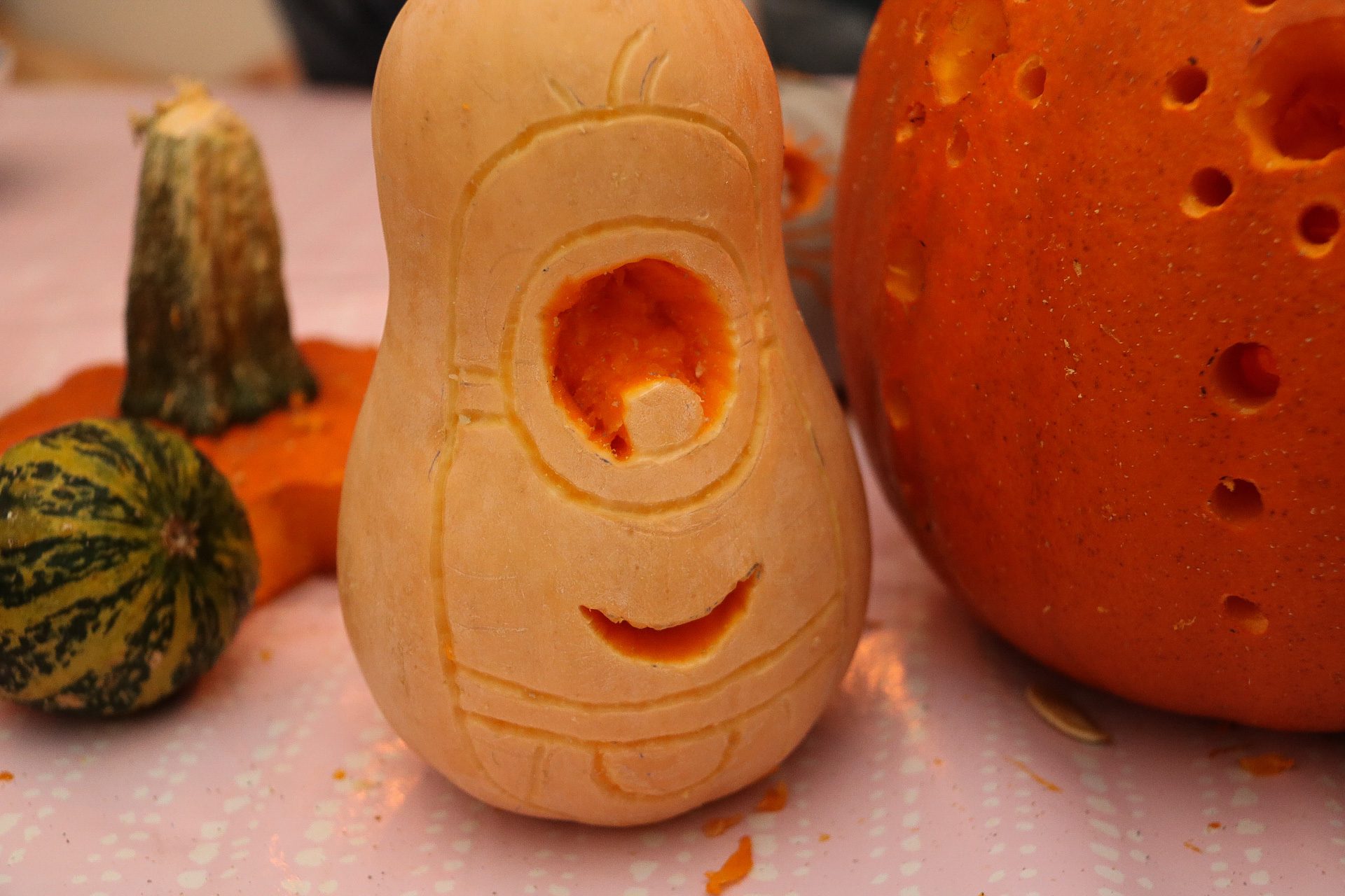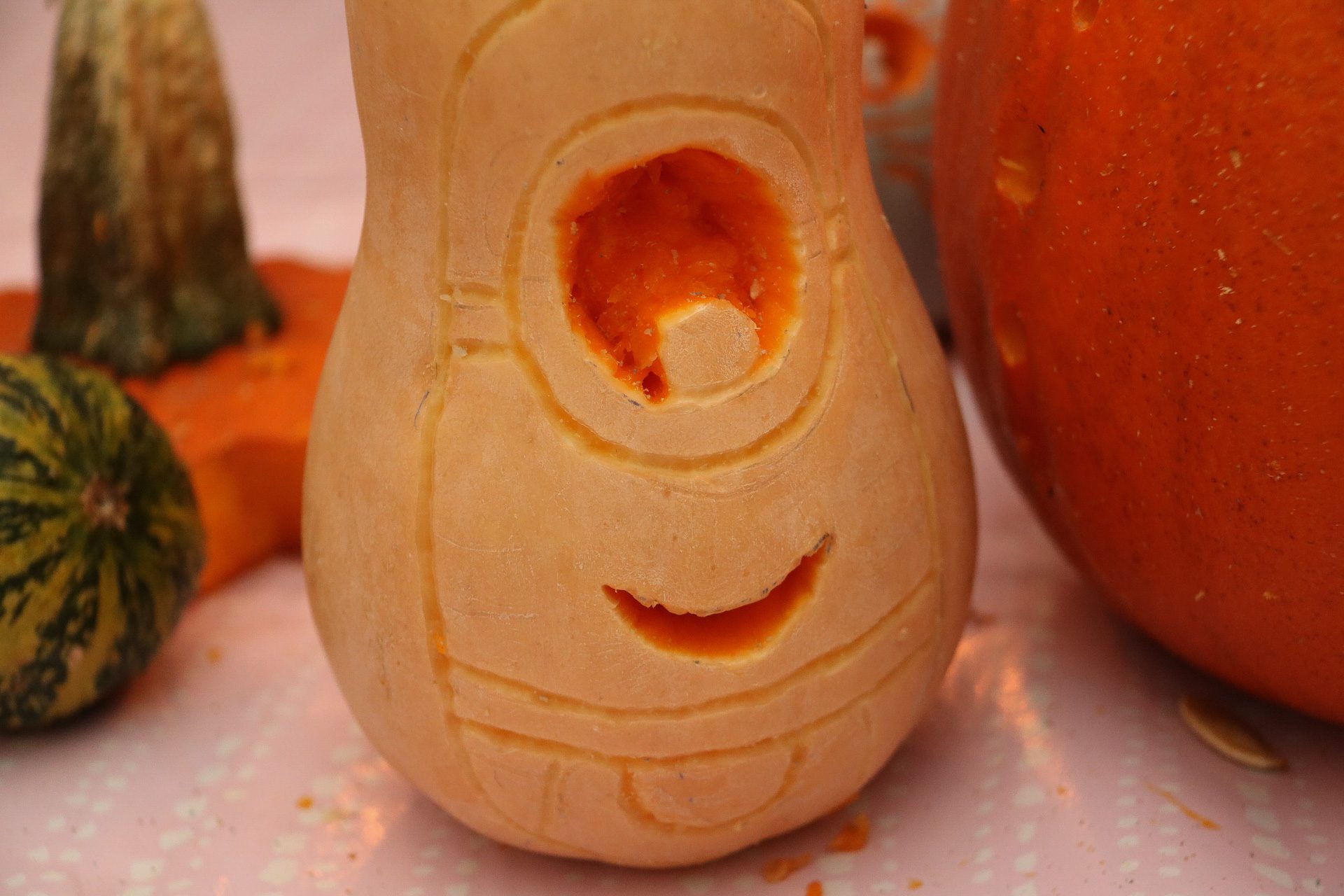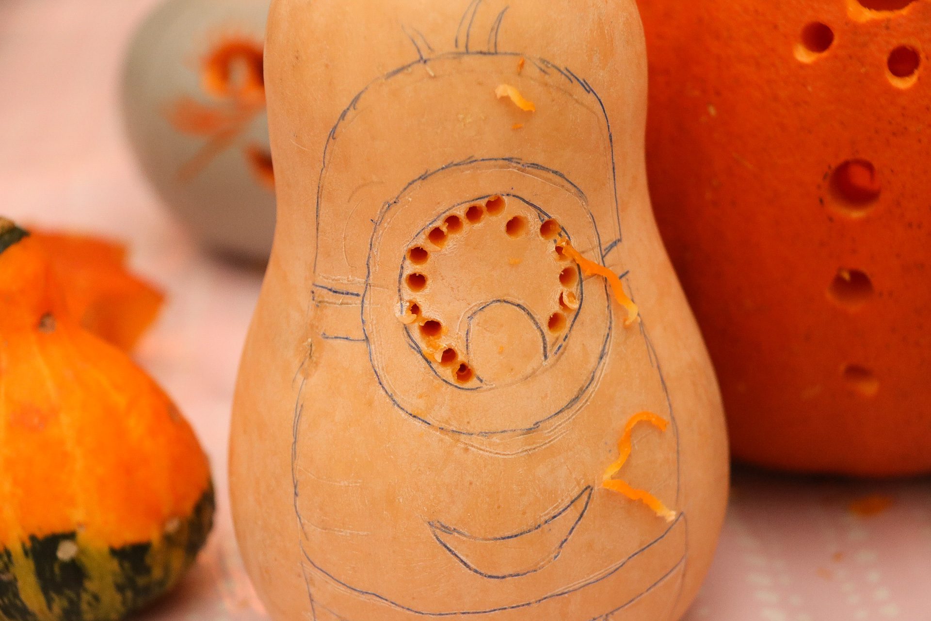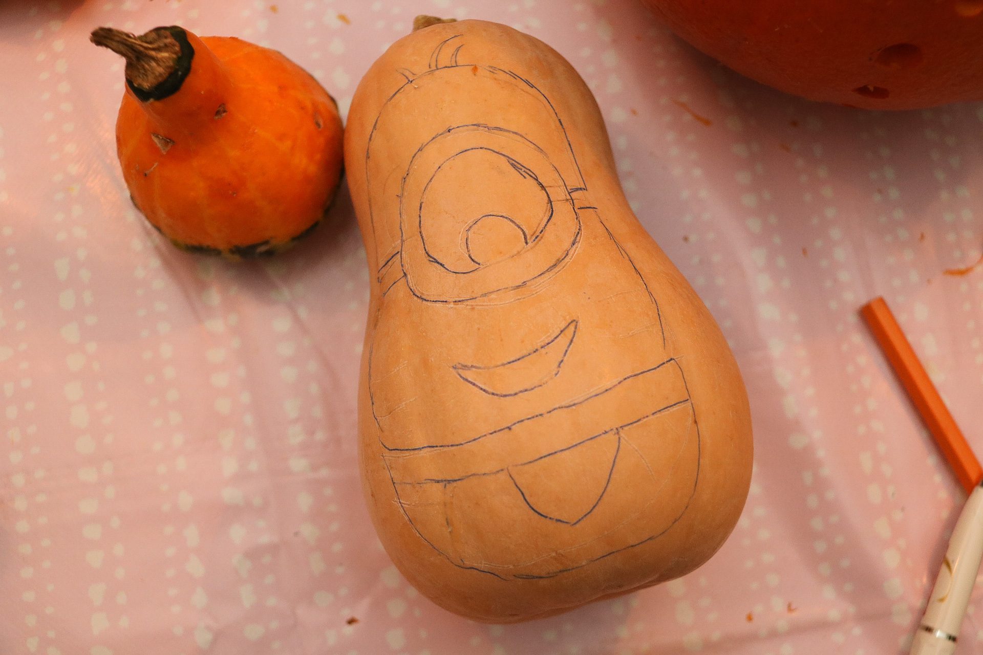 - Rita ut motivet, här har jag tittat på bilder och ritat på fri hand. Vi använde nu en butternutpumpa, för att formen passade så bra…men den var väldigt hård att skära i.