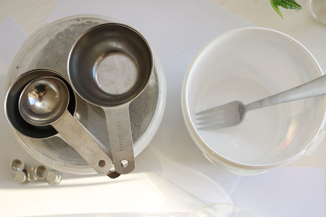 Verktyg: oöm skål/plastburk, gaffel, decilitermått, sax