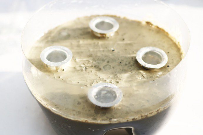 - Häll betongen i dina petflaskor, dunka till flaskorna något så att det inte bildas några bubblor.