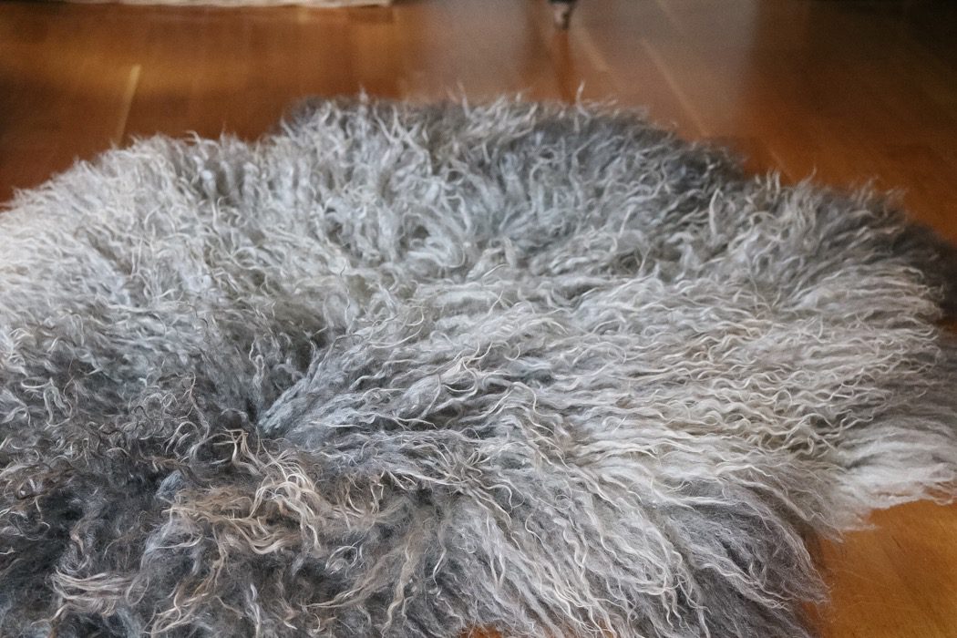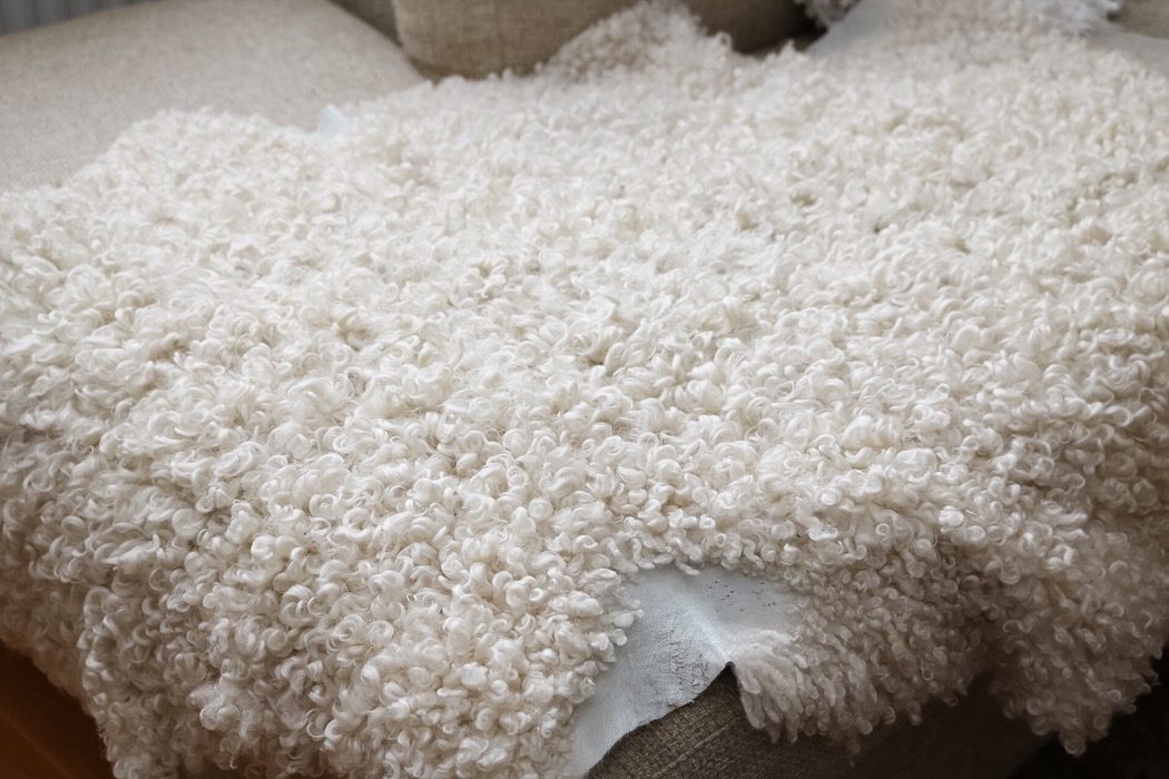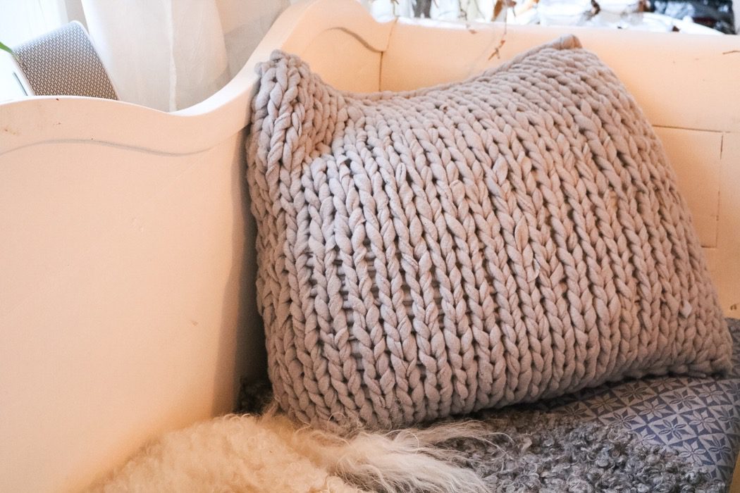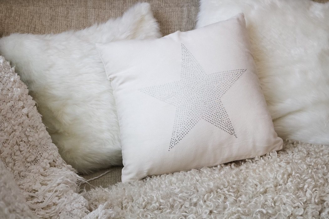 Soffan har jag pyntat med några nya kuddfodral från Ohlsons tyger, vitt, glittrigt och fluffigt! Fårskinn har jag samlat på länge, här har ni tre olika som kommer från Gotland och Öland, det är så mysigt att plocka fram till advent. Den stickade kudden har svärmor gjort, den är stickad av ett par fleecefiltar från Ikea.