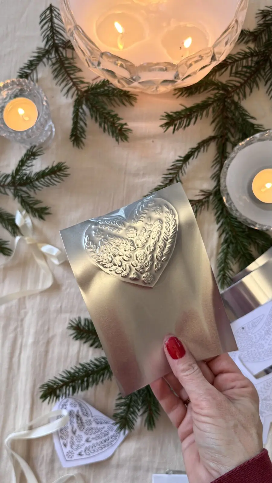 Kitet innehåller fyra stycken mönster som kan återanvändas hur många gånger som helst: Hjärta, stjärna, klöver och duva. Det ingår även en vit skumgummimatta, samt 4 silverark som räcker 8 st julhängen.