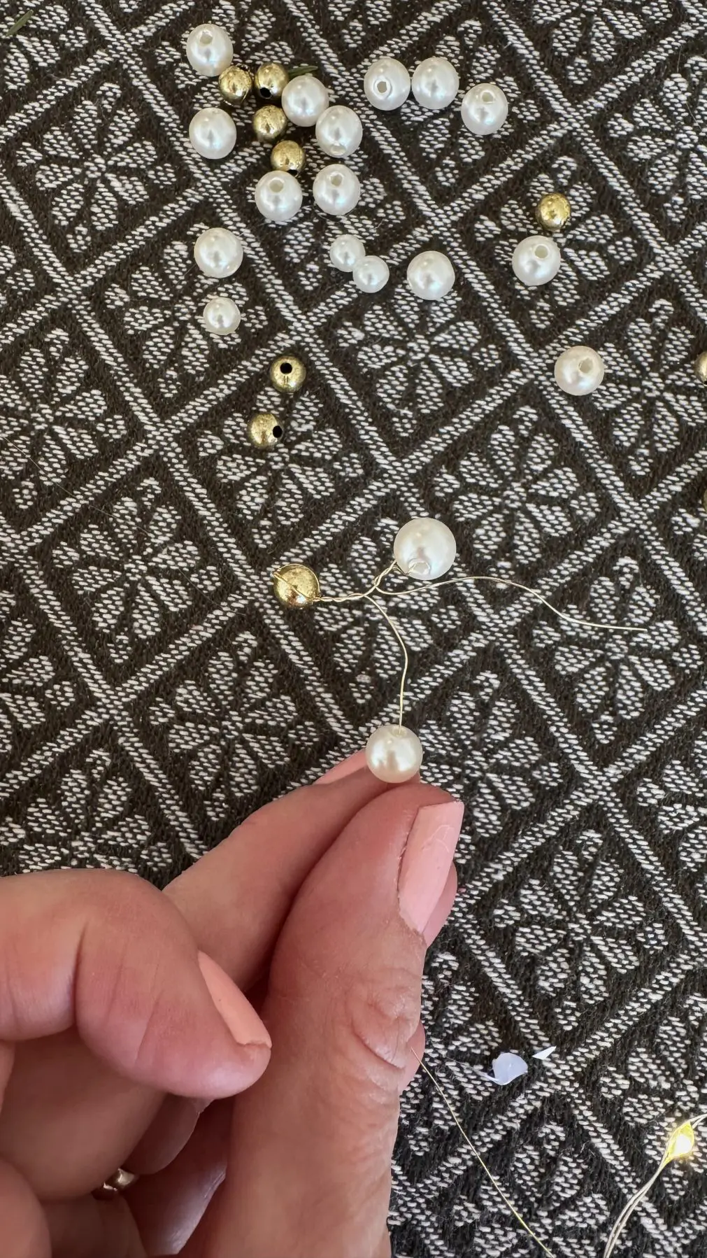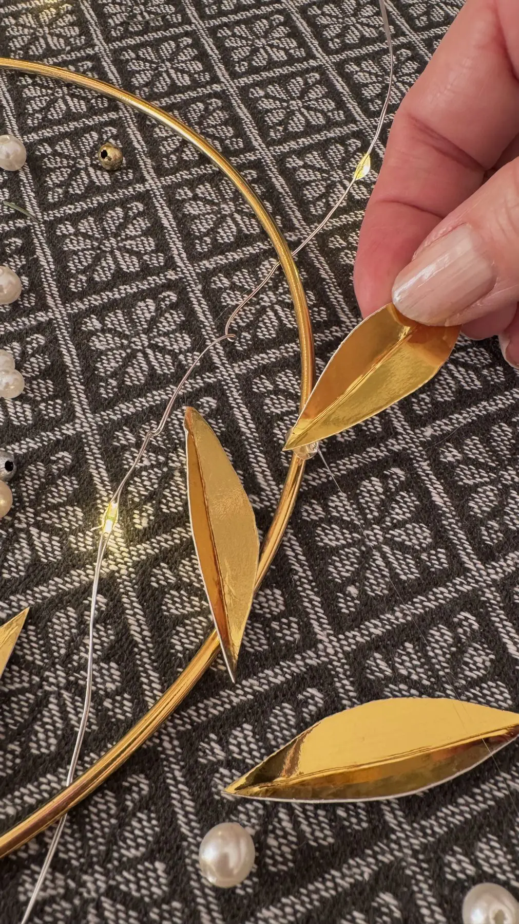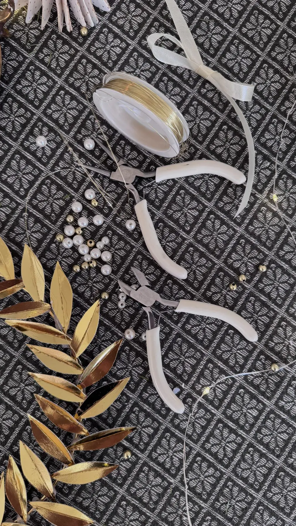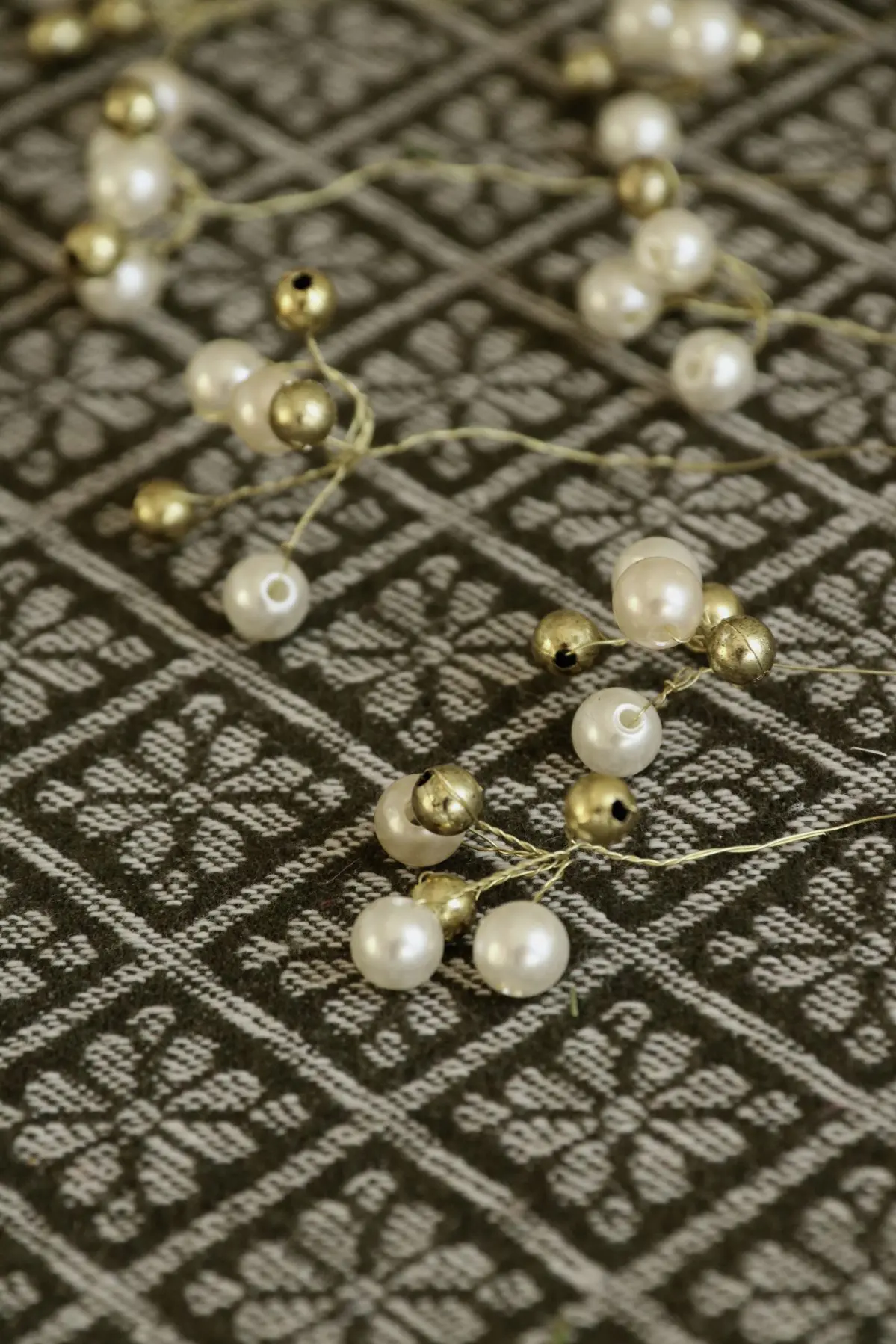 9. Dax att göra små buketter med pärlor! Knipsa av en bit (ca 20 cm lång) guldmetalltråd, samt plocka fram 3 vita och 3 guldfärgade pärlor.