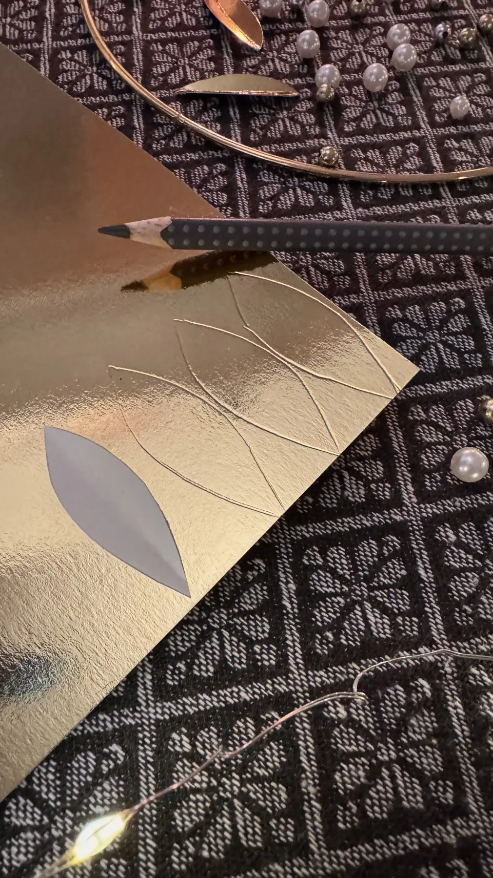 - Rita av lövmallen på guldkartongen och rita massor på en lång remsa guldkartong.