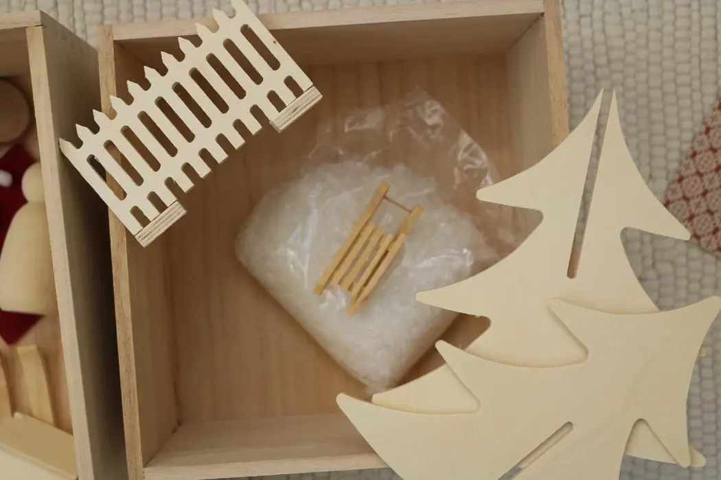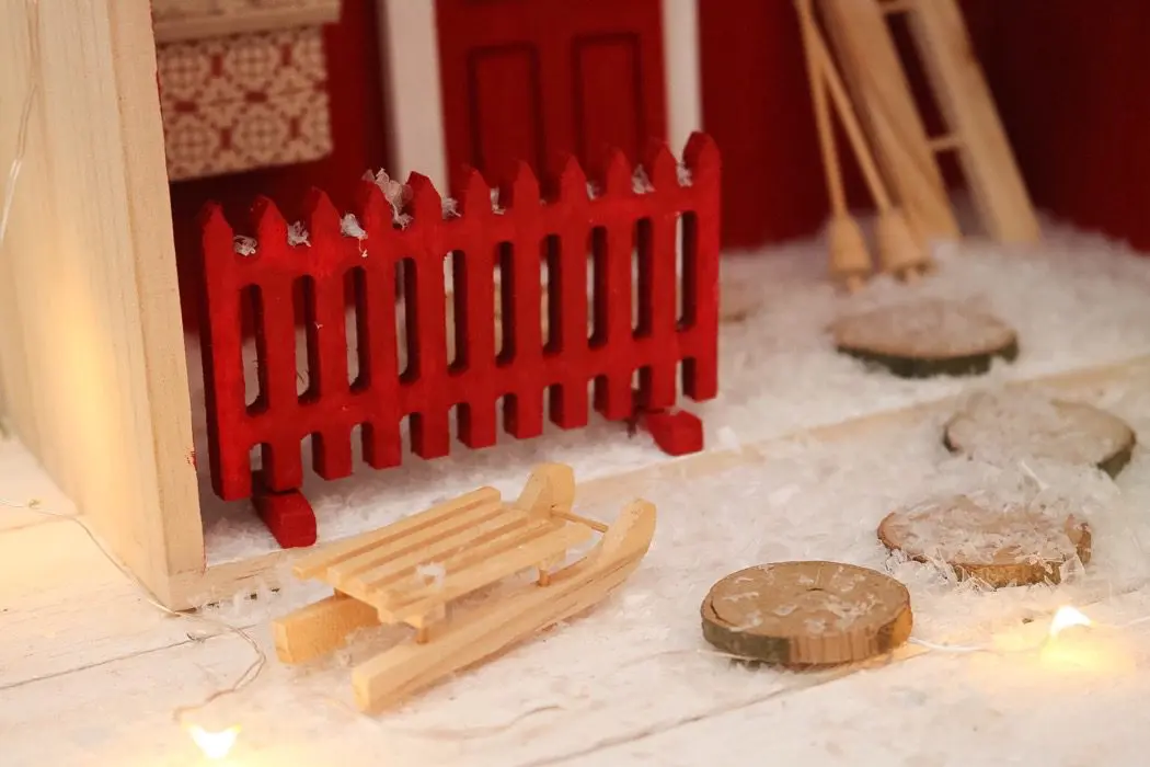 Ställ dit staket, kälke och lägg gärna ut en ljusslinga. Allt följer mer i paketet, även ljusslingan.