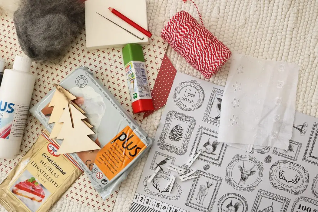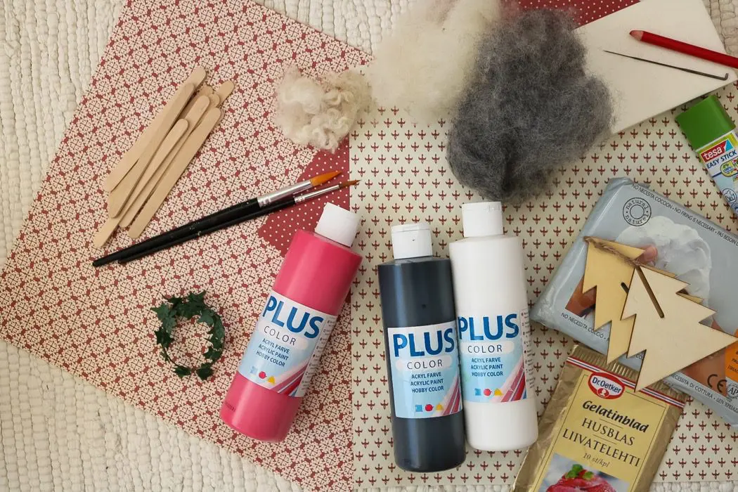 Det här paketet kommer från Creativ Company, sen har jag lagt till några saker..här kommer en lista, men tänk på att det bara är ett förslag, tag det du har hemma…och låt fantasin flöda! Ta hjälp av barnen, och pyssla till tomtens värld hela julmånaden!