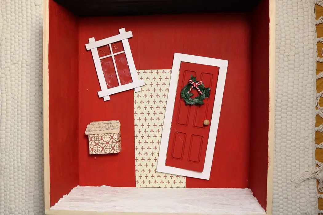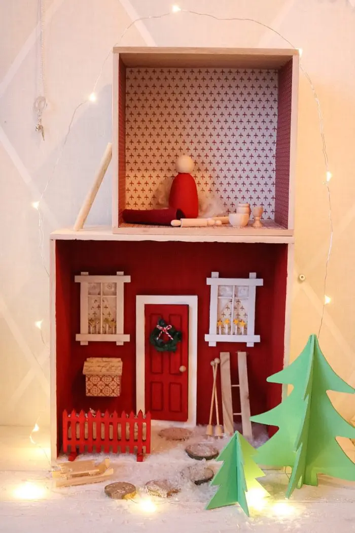 Egentligen är det tänkt att man ska sätta upp dörren på en list inomhus, men jag valde att göra en liten ”Tomtevärld” i en trälåda. Då kan man ta fram lådan varje år…som en jultradition!