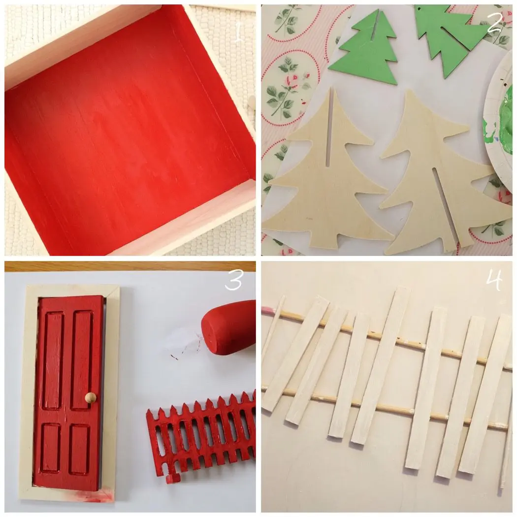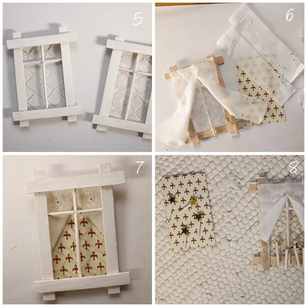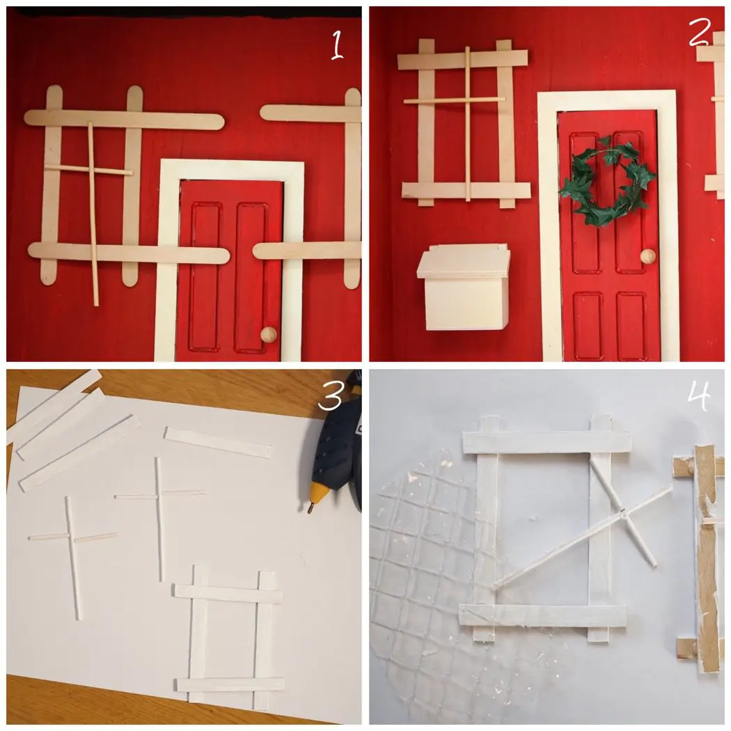 - Måla ”glasspinnar” vita. Det är själva dörrkarmarna som jag knipsat av kanterna på, måla även små grillpinnar/tandpetare som jag använt till ”fönsterspröjs”.