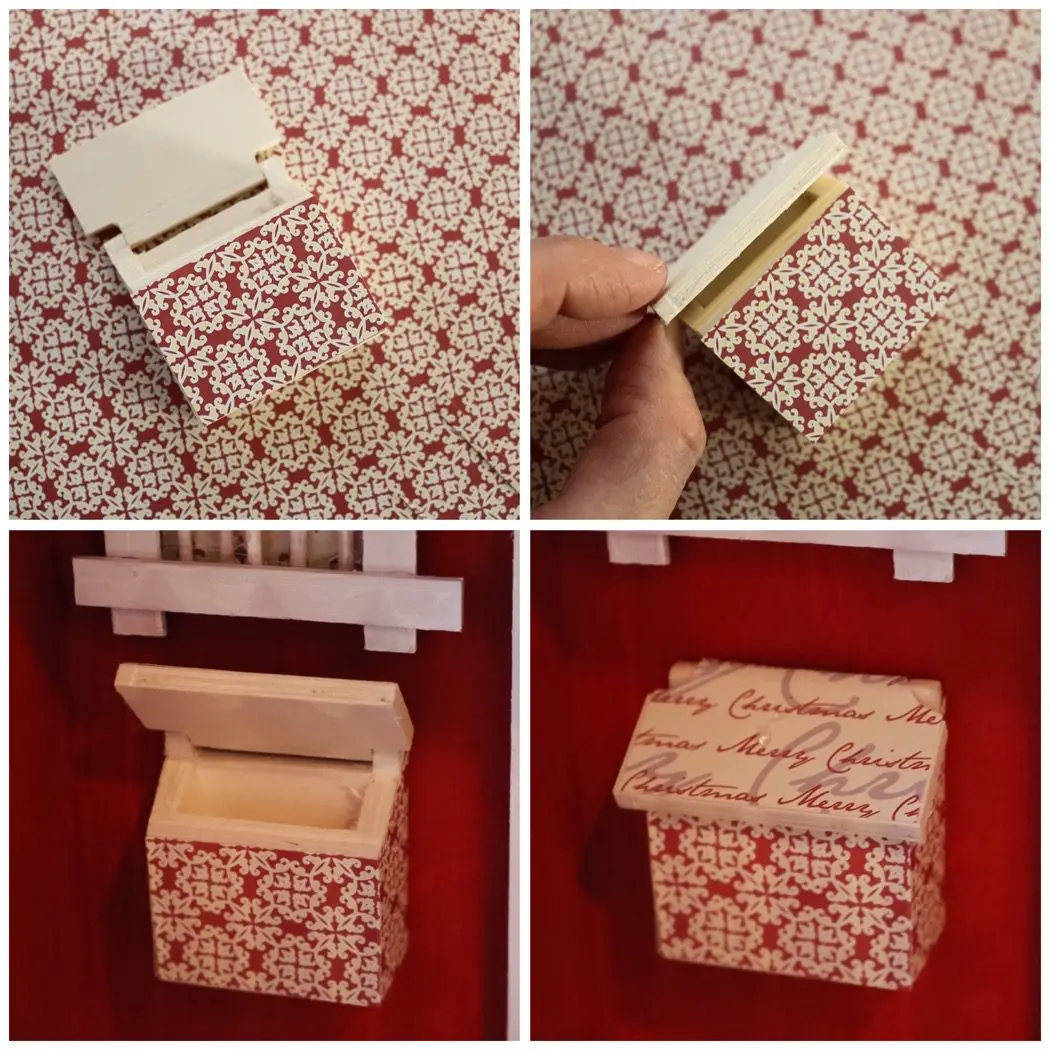 1) Börja med att limma fast, mönstrat papper bakom dörr och fönster. Har man en fin såg, kan man ju såga ut hål här istället och sätta en ljusslinga.