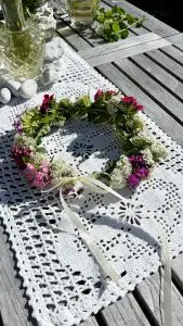 Det kanske ser avancerat ut, men är mycket enklare än vad man kan tro! Med ett reglerbart snöre baktill på kransen så passar kransen alla huvudstorlekar. Den här gjorde jag av köpeblommor, och de höll verkligen bra! Den blev även fin som torkad. Till midsommar kan man ju plocka det som finns i naturen, som björkblad, blåbärsris och dikesblommor.
