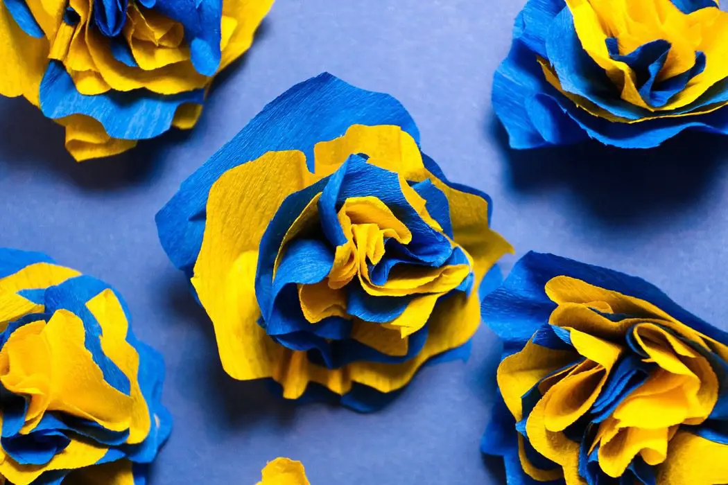 - Klipp till ca 2 dm långa och 2 cm breda remsor av blått och gult kraftigt papper.