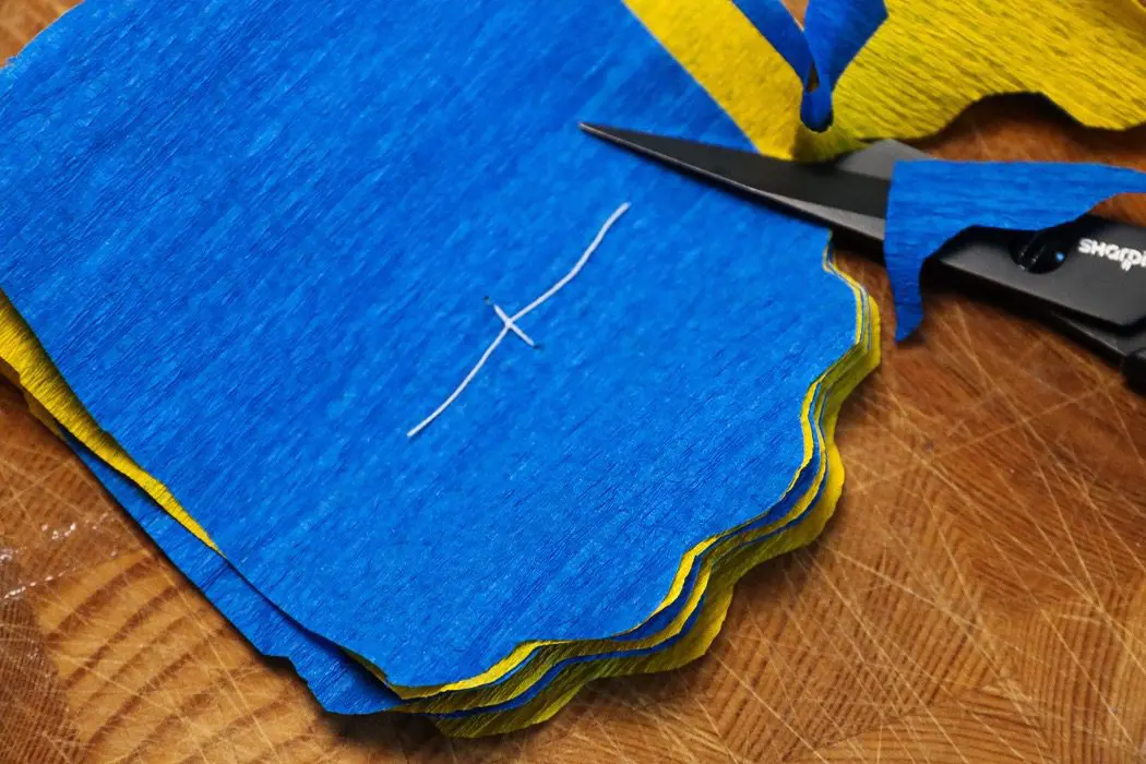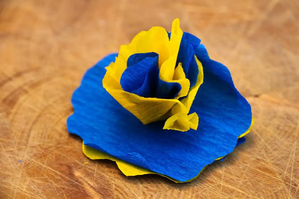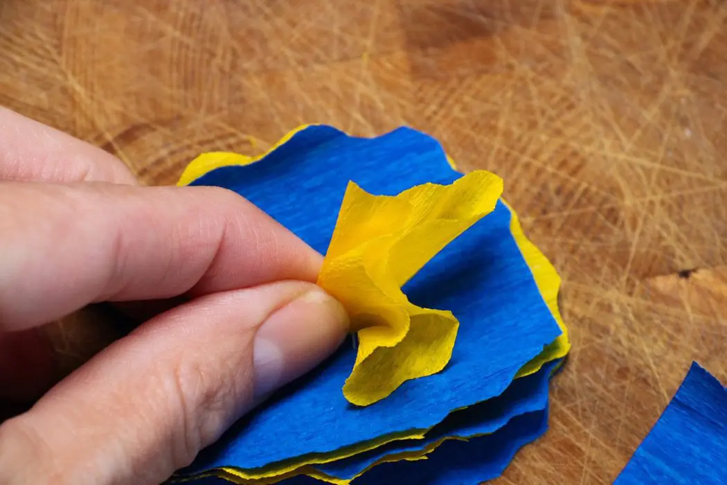 - Gör stora Crepeblommor och strö ut på bordet (tag då några extra lager papper).