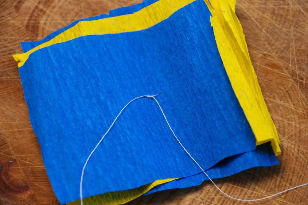- Klipp till minst 6 st fyrkantiga pappersbitar av crepépapper (Det var yngsta tjejen som gjort sådana på fritids. De valde att klippa pappersbitarna i fyrkanter först…säkert det enklaste sättet). Lägg varannan gult och varannan blått papper.