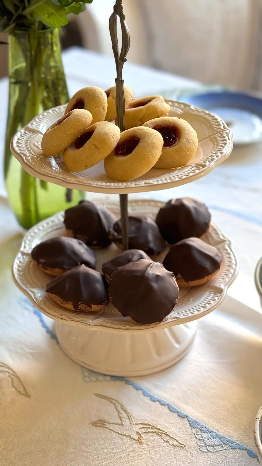 Jag dukade med porslin som jag fått av mormor, skedar från farmor och så den fina matchade duken som svärmor broderat! Fatet längst fram var det jag målade hos Paradisverkstans workshop, så kul att ställa fram och använda! Ett våningsfat till kakor är något jag haft länge och toppen att servera kakor och snittar på.