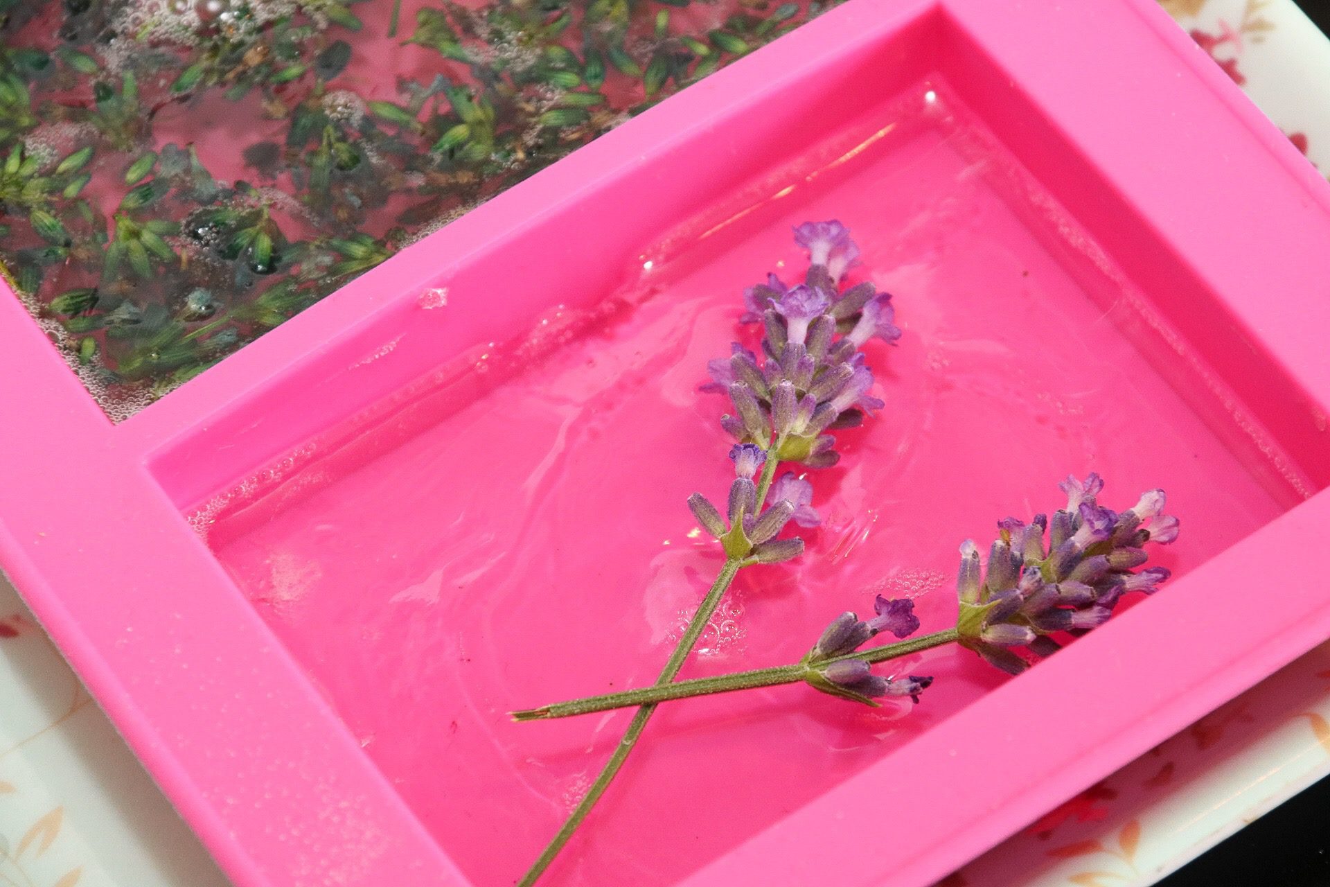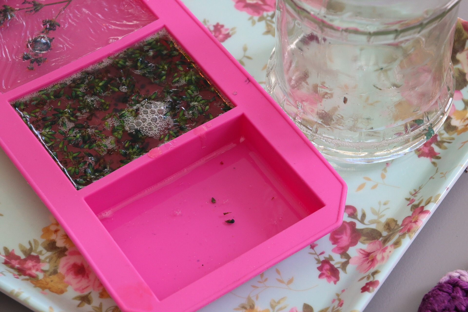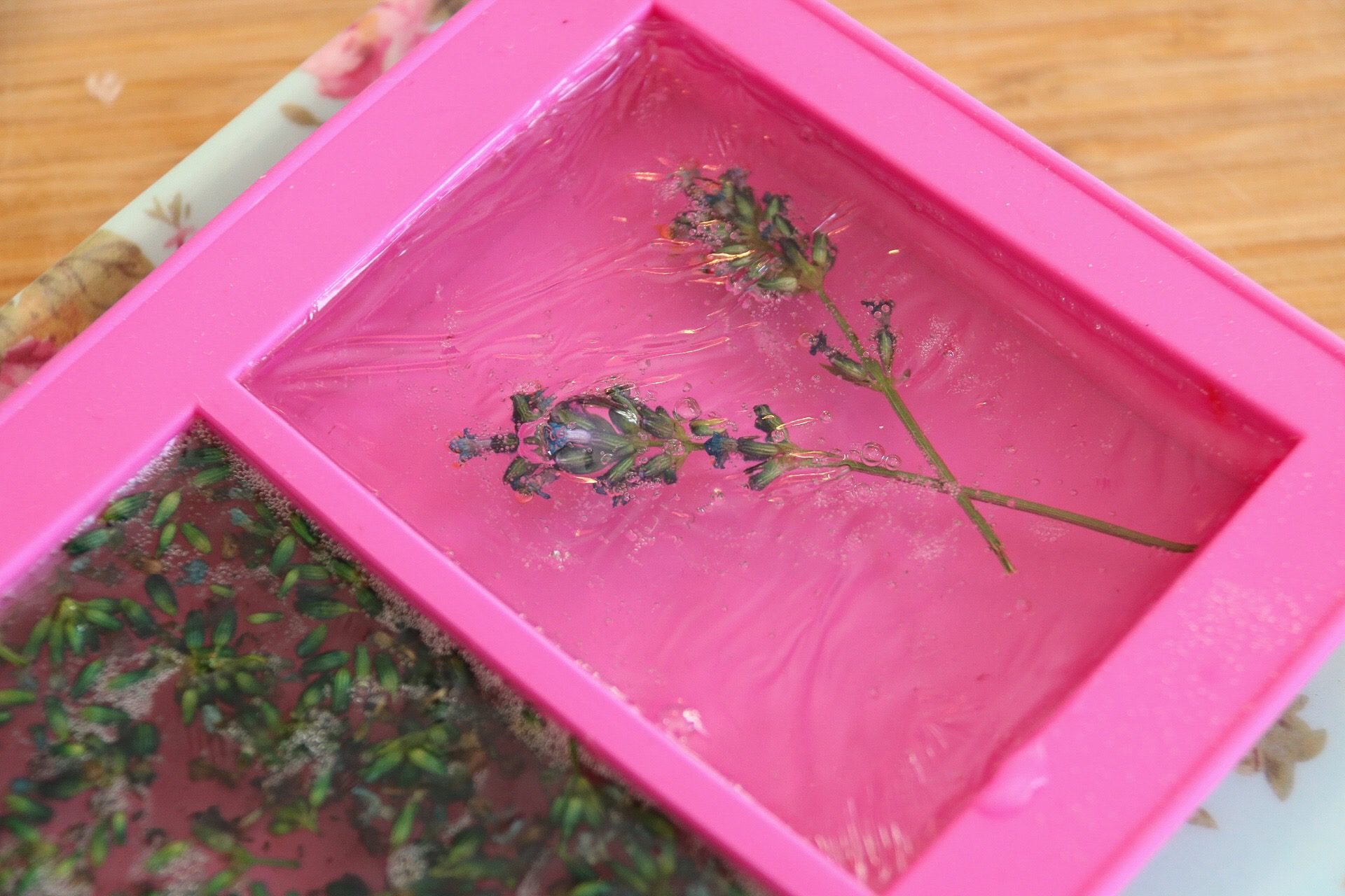 Smält klar tvålmassa, häll i halva formen med tvålmassa, låt massan stelna på ytan…ca 10 minuter. Lägg på lavendelkvisten, häll på resten av tvålmassan, låt stelna 1-2 timmar.