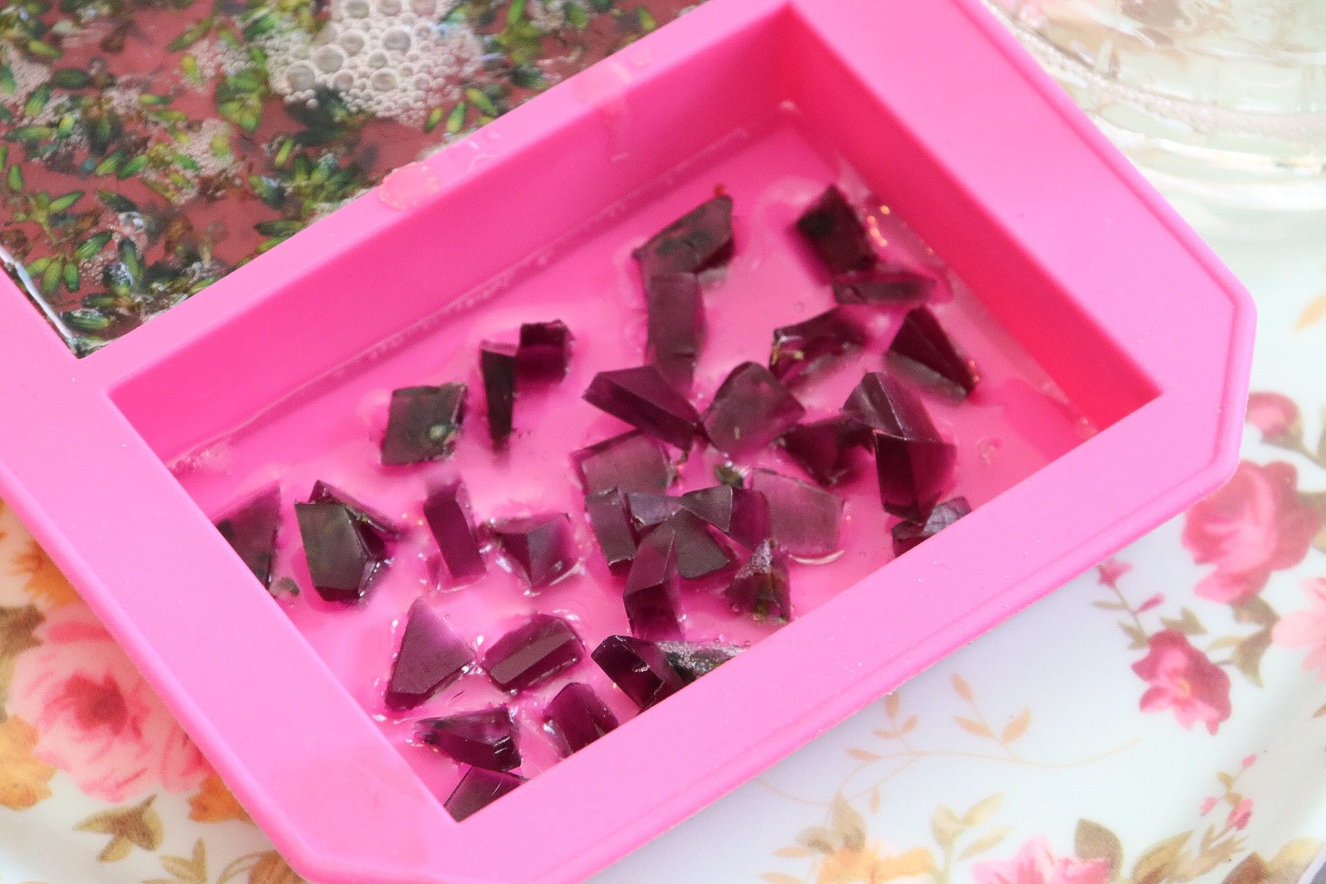 Plocka ur den lila tvålen när den stelna. Hacka den i minibitar som trekanter/trianglar. Lägg småbitarna i formen. Smält klar massa, häll massan i formen över de triangelformade bitarna. Häll i ungefär halva formen, låt stelna något och lägg på fler lila småbitar…fyll på med mer massa. Låt stelna helt.