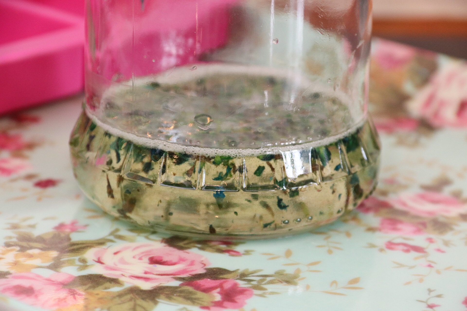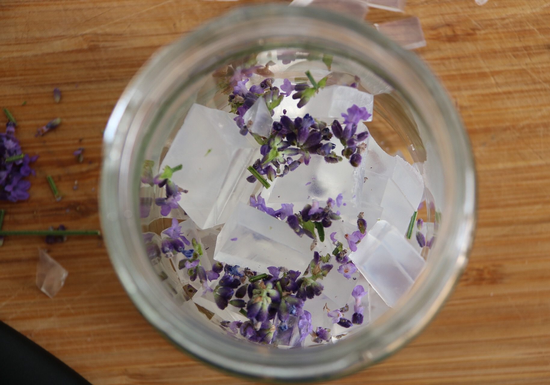 4) Lägg tvålbitarna och lavendeln i glasburken.