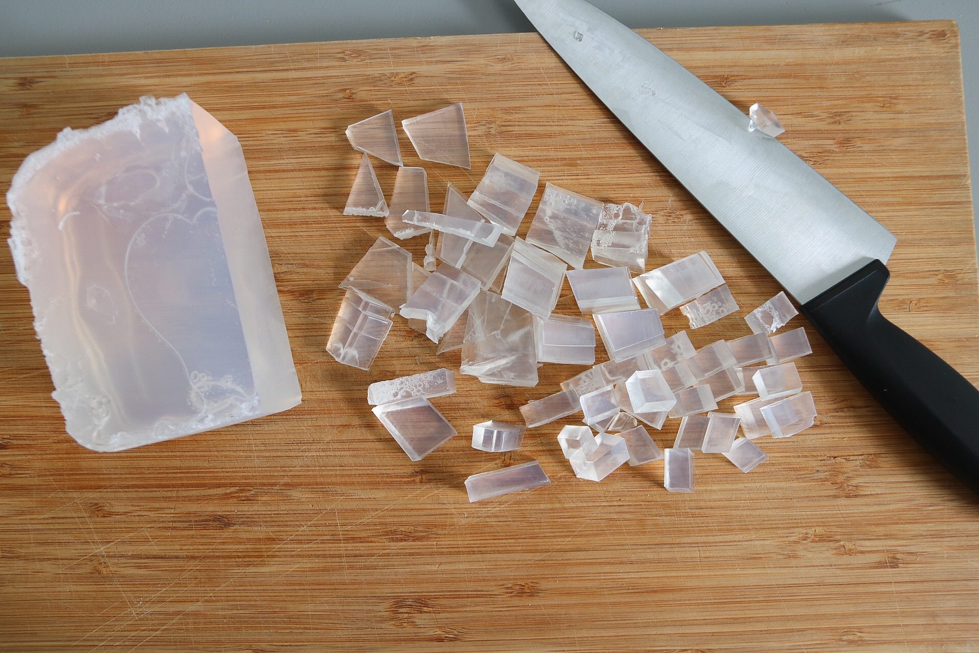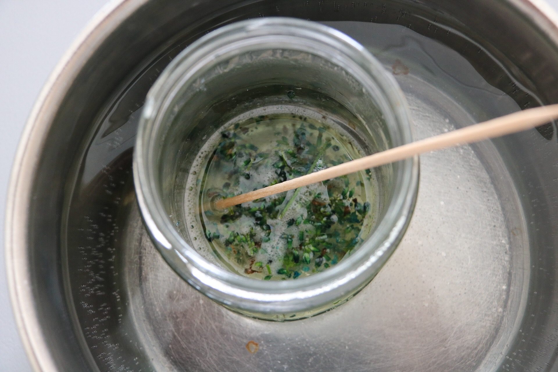5) Ställ glasburken i vattenbad, och låt den smälta. Rör så lite som möjligt, det blir lite skummigt på tvålens yta om man rör för mycket. Dax att hälla upp i formar!
