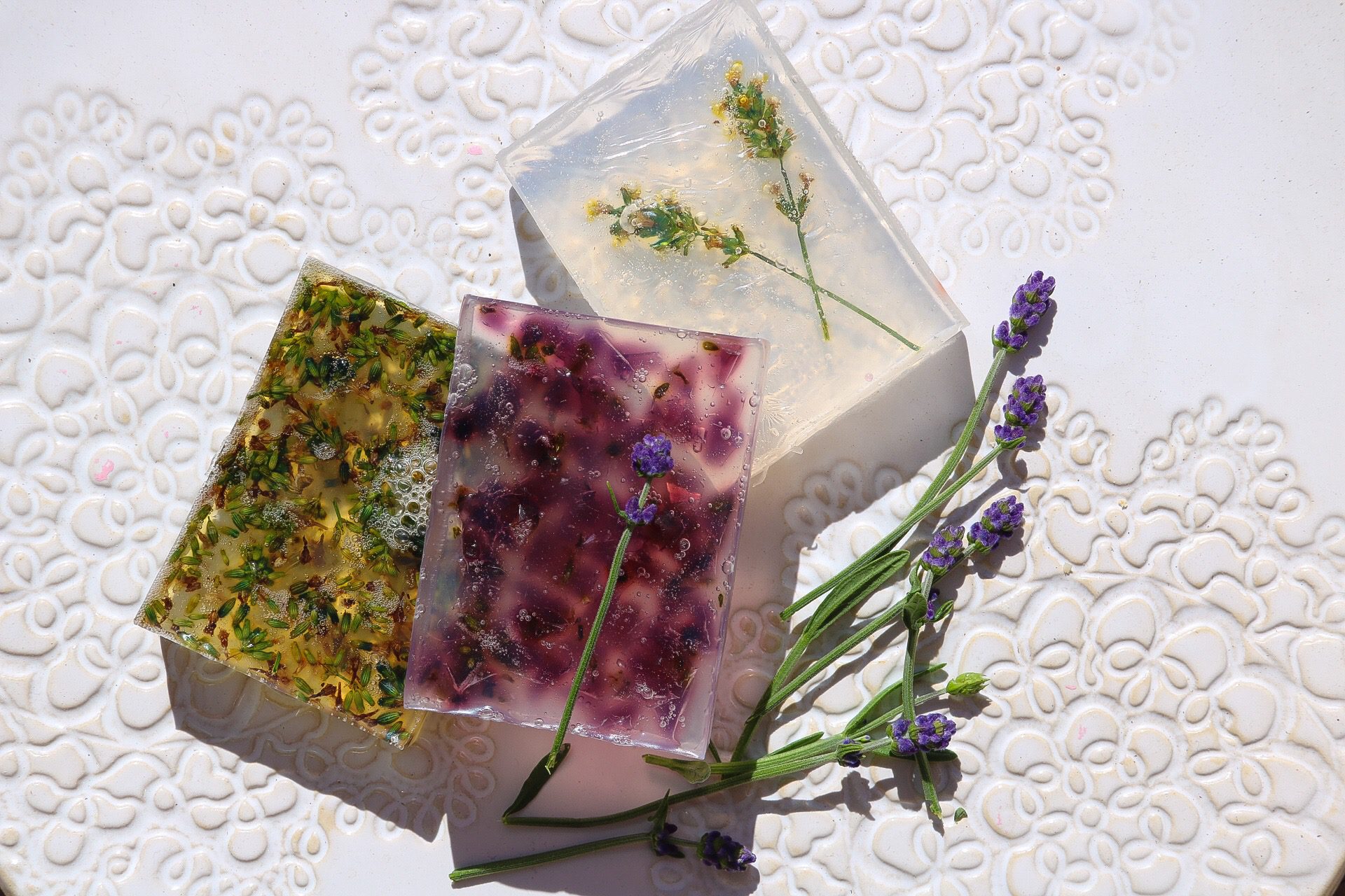Med färdig tvålmassa, är det hur enkelt som helst att göra egen tvål! Fantasin kan man lägga på vilka blommor man ska blanda i, vilka färger, vilka former och hur man ska förpacka dem. Barn brukar gillar att skära, blanda och smälta…sen finns det en klar bonus, man kan ju skulptera fina former av tvålen!