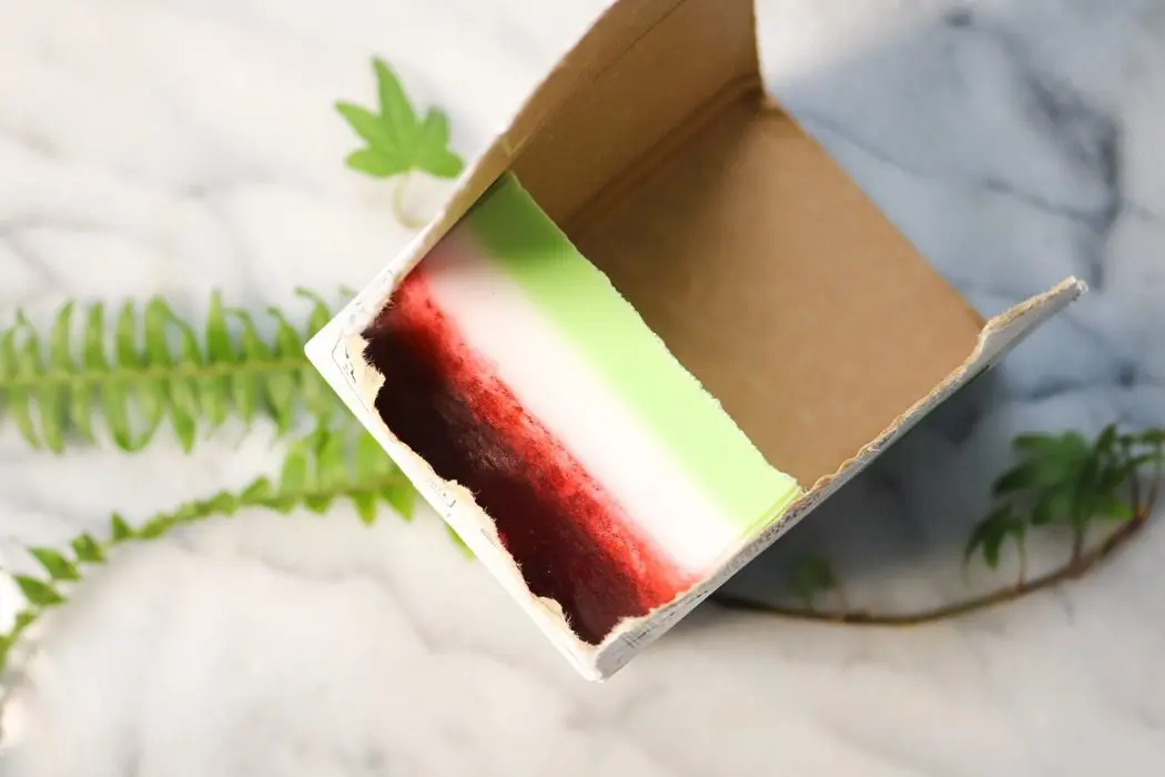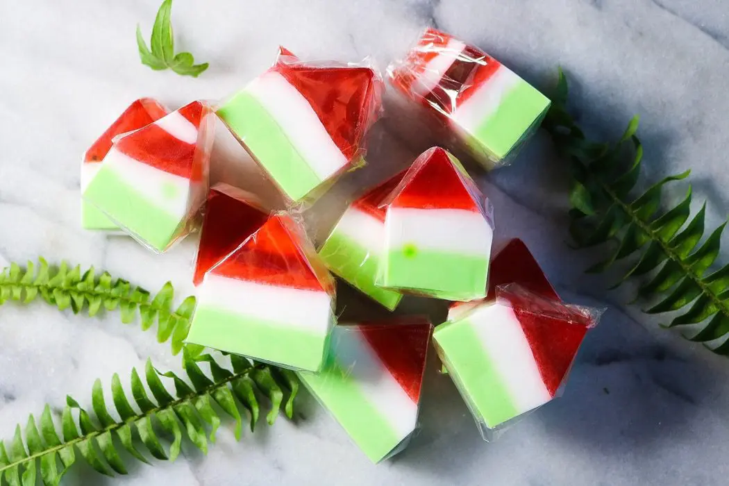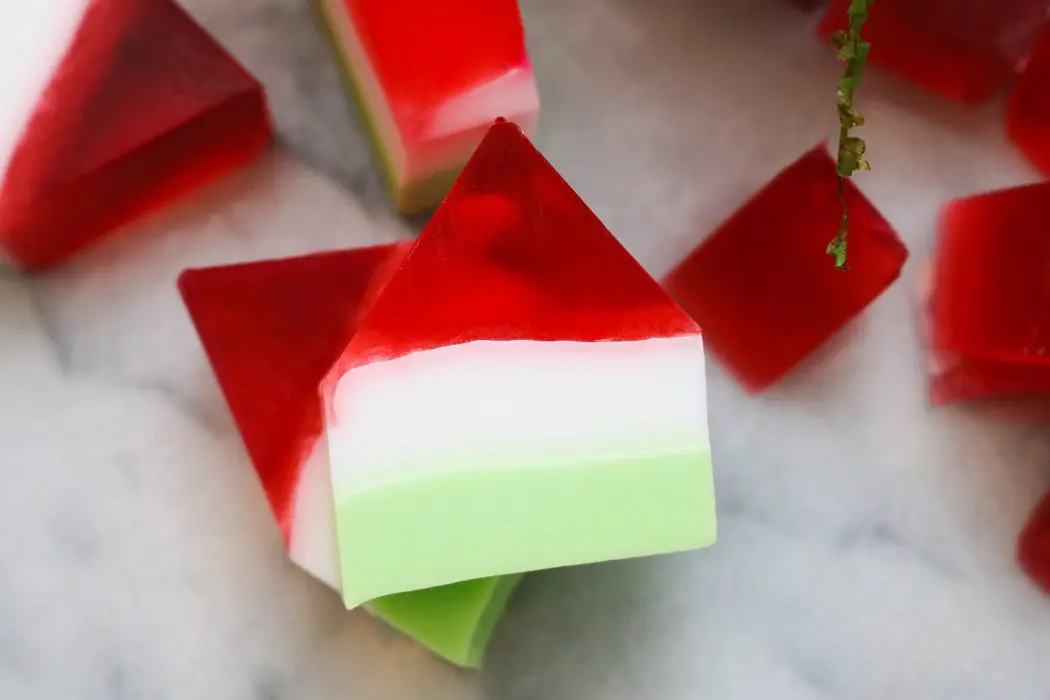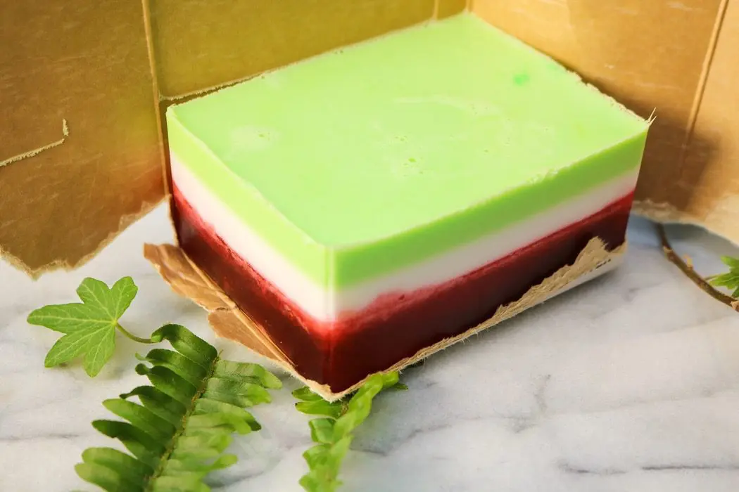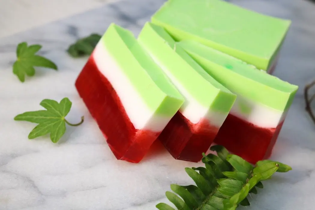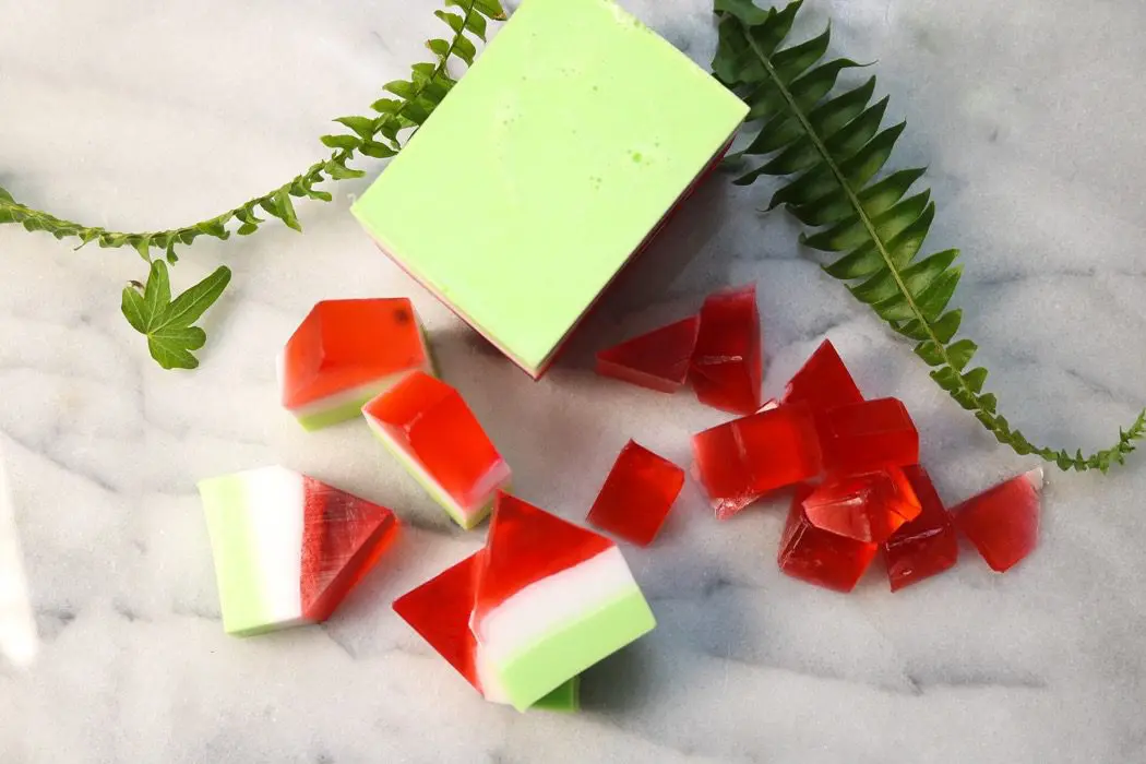 Skiva tvålen med en vass kniv. De är fina som de är i denna form, men vill man mer att de ska likna vattenmelonbitar så delar man varje skiva i två bitar, och skär sedan av sidorna, så att det bildas en spets.