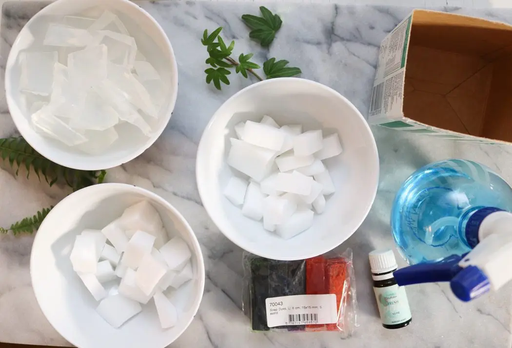 Börja med att skära tvålmassan i mindre bitar, dela upp dem i tre skålar. Större mängd av den genomskinliga. Tips! Vill man ha större del av den röda massan, tar man ca 300 gr tvålmassa. (Jag använde ett 1 1/2 mjölkpaket, tar man ett mindre paket blir tvålmassan högre.)